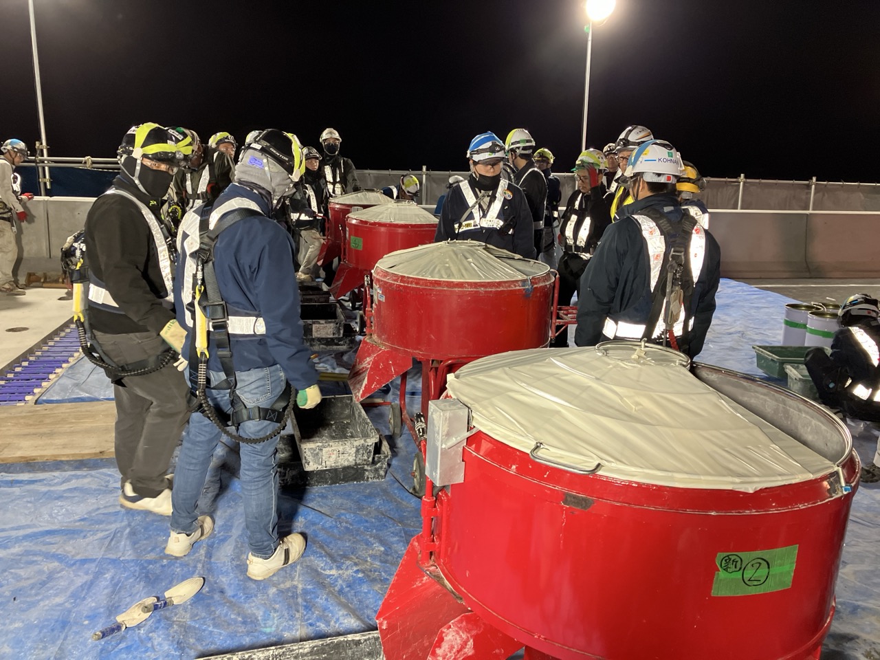 間詰めコンクリート 24N/mm2/hで設計。練混ぜ後15分で硬化開始