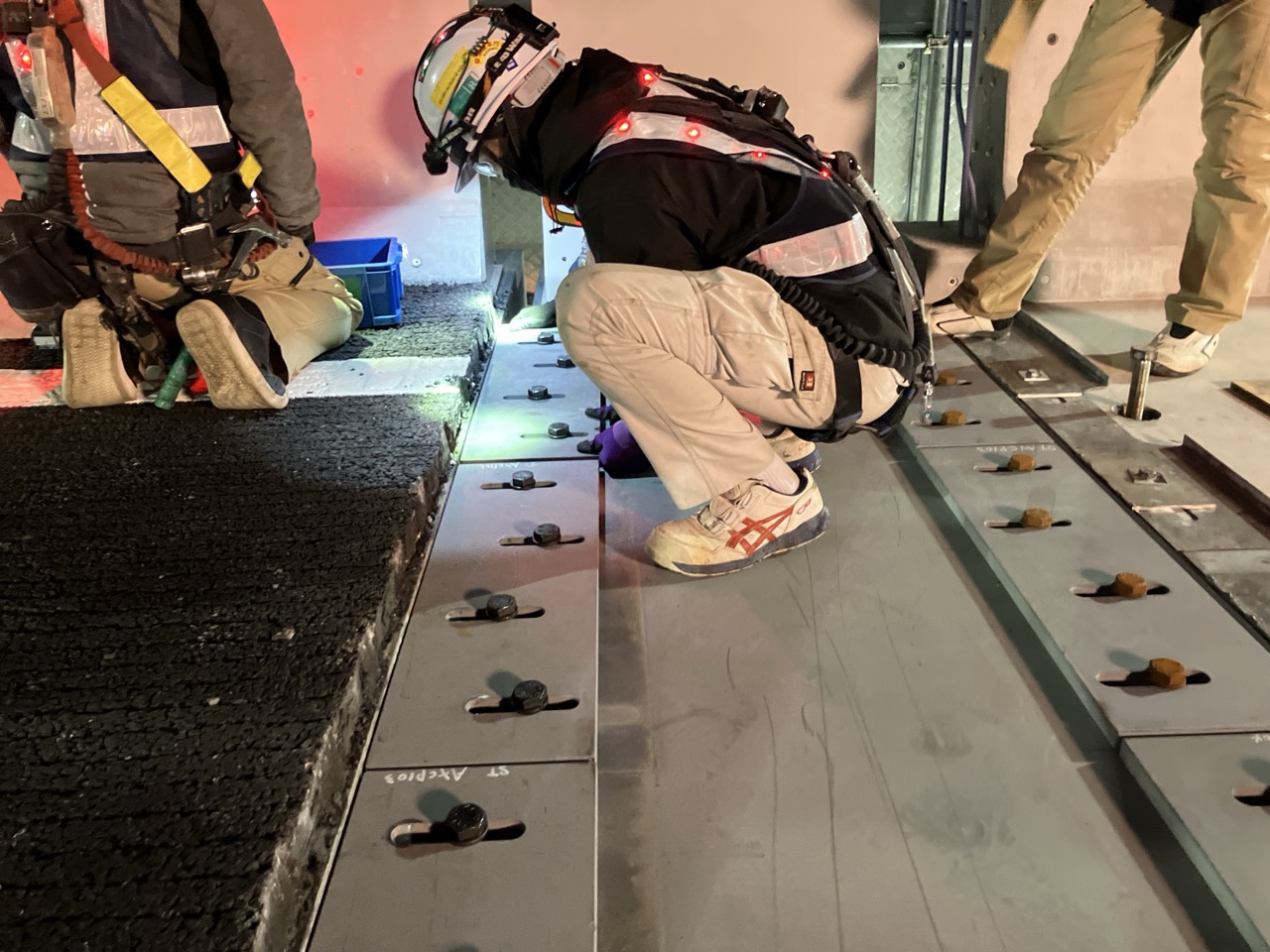 所定の枚数を撤去した後に、場所によっては仮設鋼床版と主桁の仮接合した位置にスタッドを打たなくてはいけないこともあるため、そうした箇所については、清掃程度を行った後に、スタッドを溶植し、(養生不要な大日本塗料製の)メタモルシートを用いて防錆処理を行う。次いでプレキャストPC床版を架設し、コッター継手のボルト締めを行う。