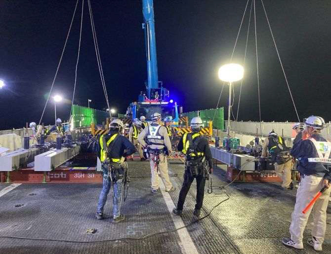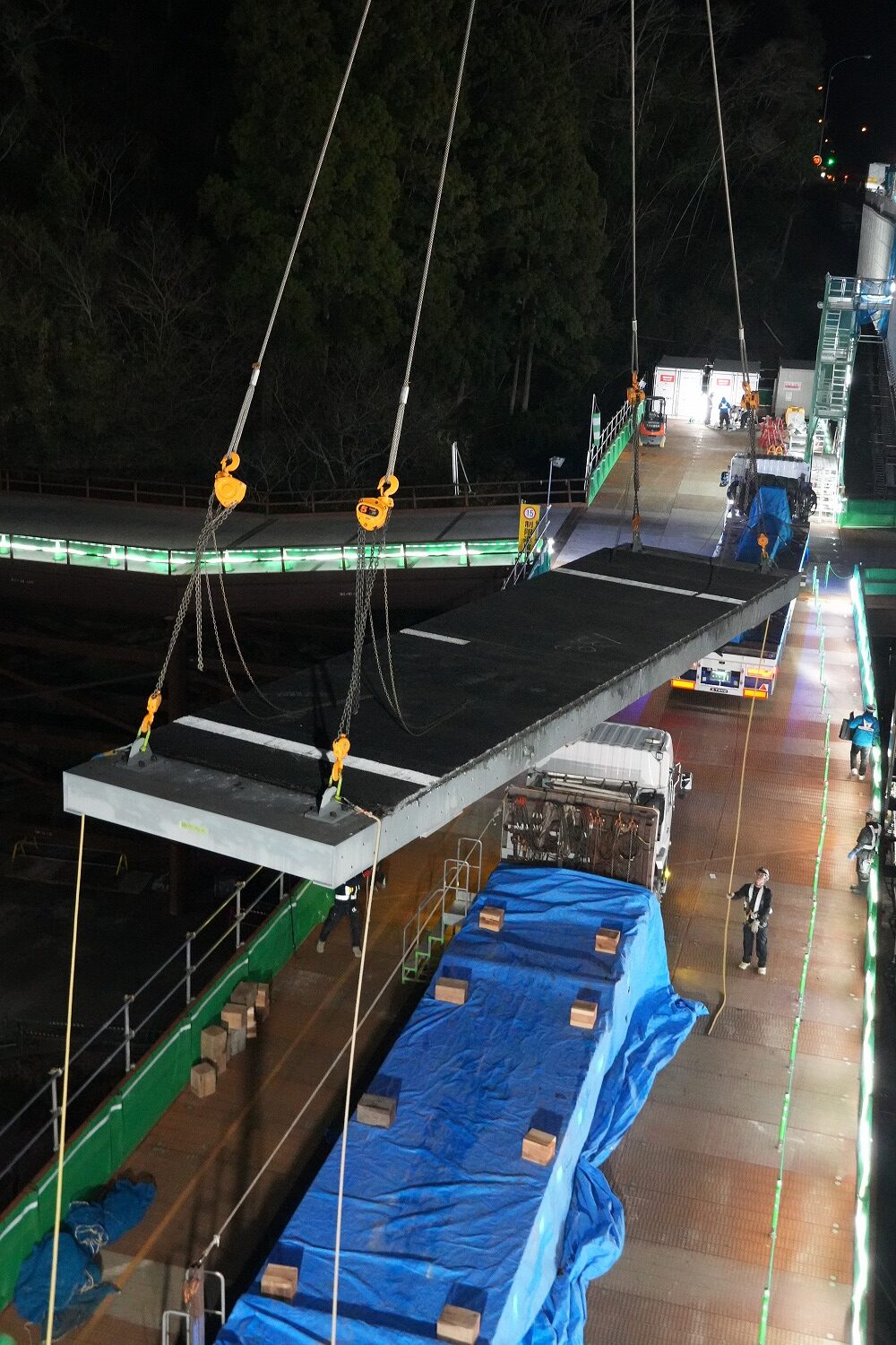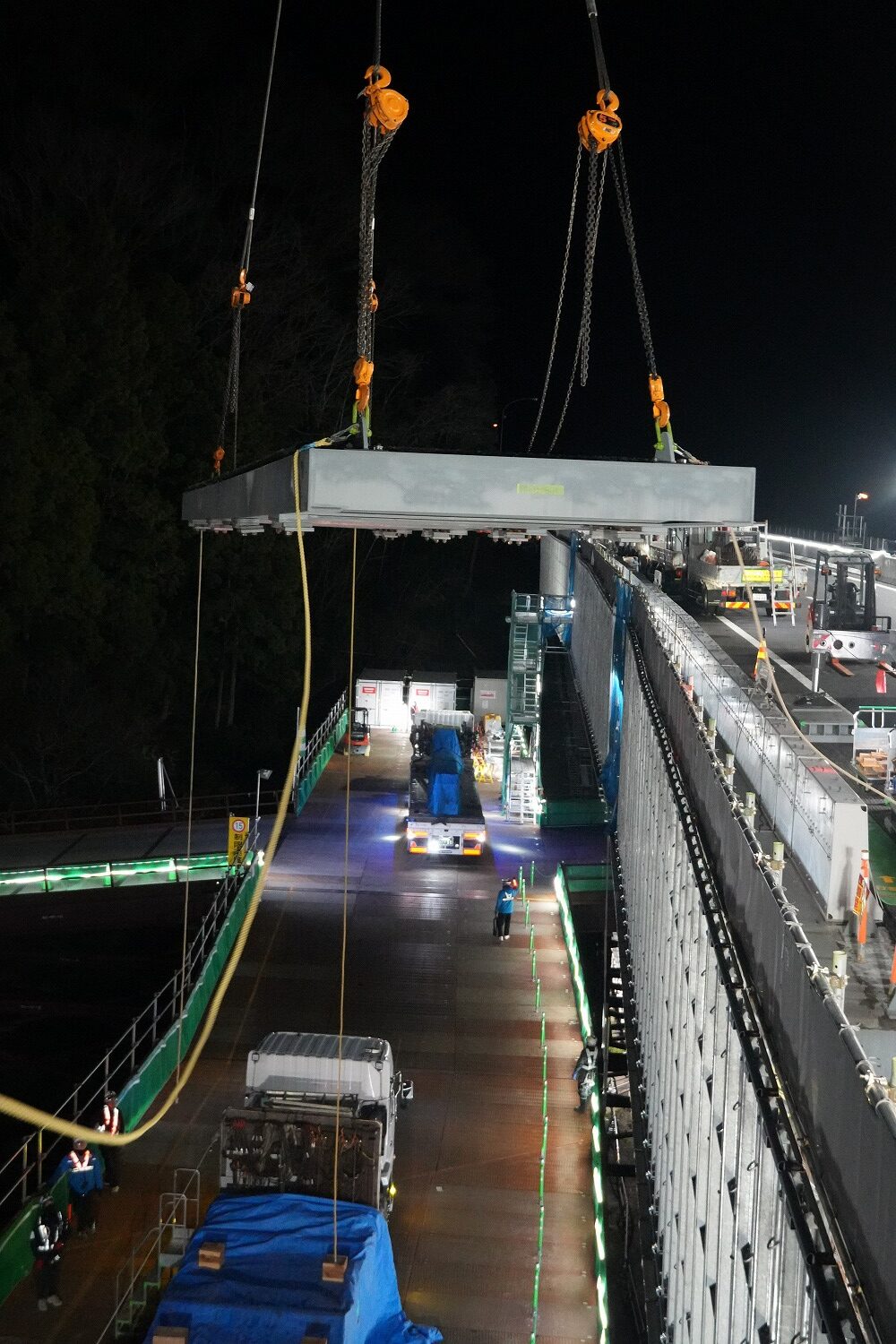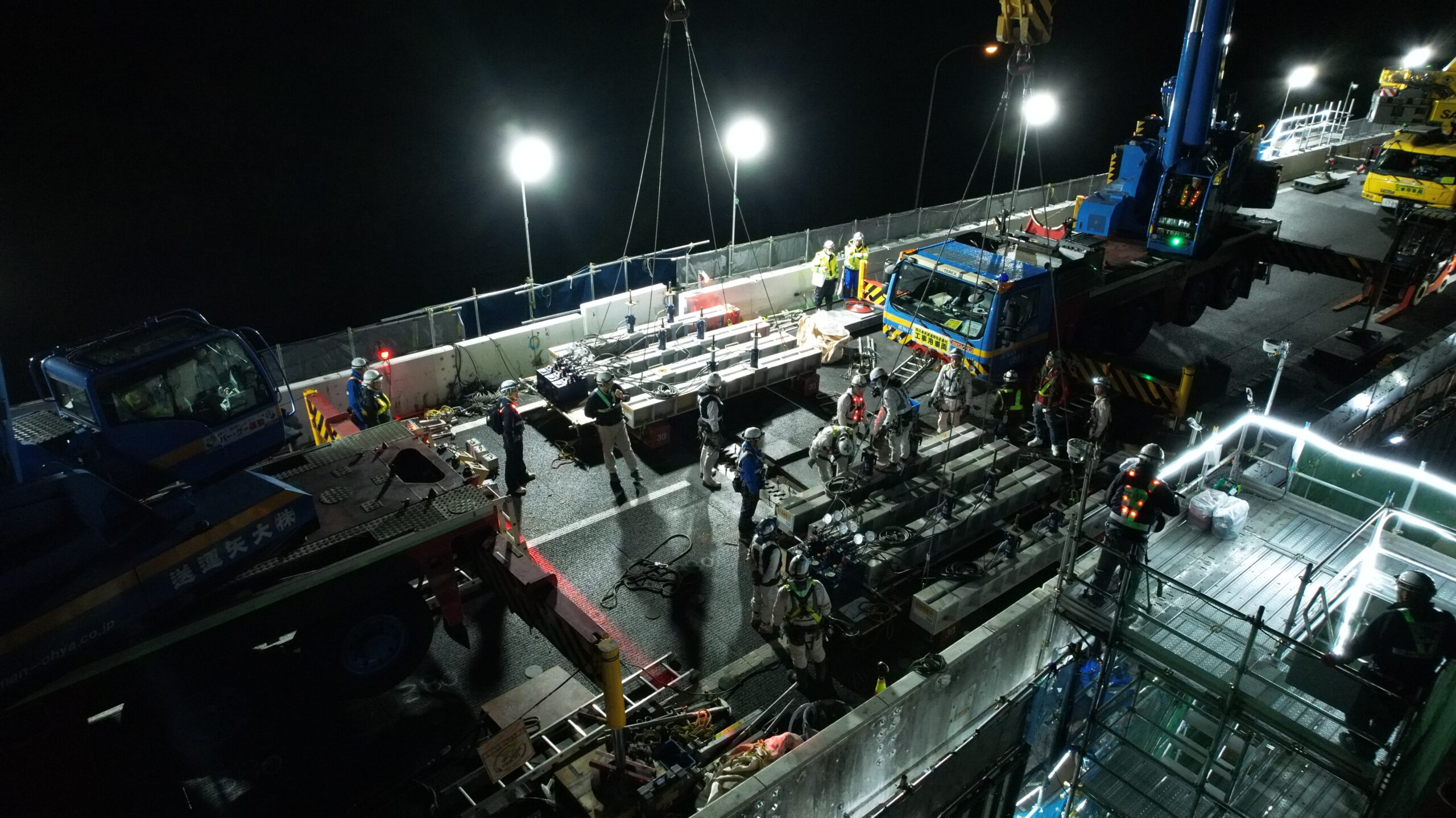 そして集中工事当夜に、仮置きヤードから現場に運送することにした。仮置きヤードから現場までの運搬時間は通行止め区間に入場する正規ルートで40分程度であり、プレキャストPC床版荷下ろし後に撤去した仮設鋼床版の積み込み・運搬を併せた時間であっても、ドライバーの働き方改革の労働時間上限値を十分守ることができるようにしている。これは前述の仮設鋼床版も同じで、JFEの津工場で製作した仮設鋼床版を仮置きヤードまで輸送し、それを中継地点として、現場まで運ぶという工程を繰り返している。STEP1とSTEP2が混在すると既設床版の搬出、仮設鋼床版・鋼製高欄の搬入・搬出、プレキャストPC床版の搬入といったトレーラー作業が錯綜する。そのため、距離を詰めて労働時間に余裕を持たせるための施策である。