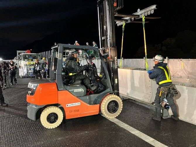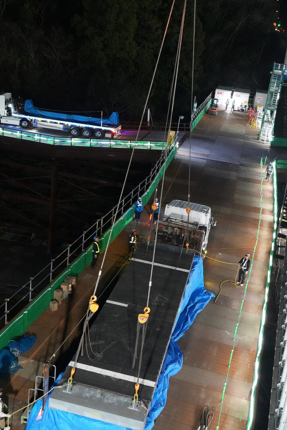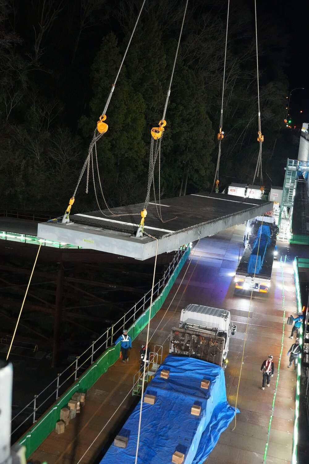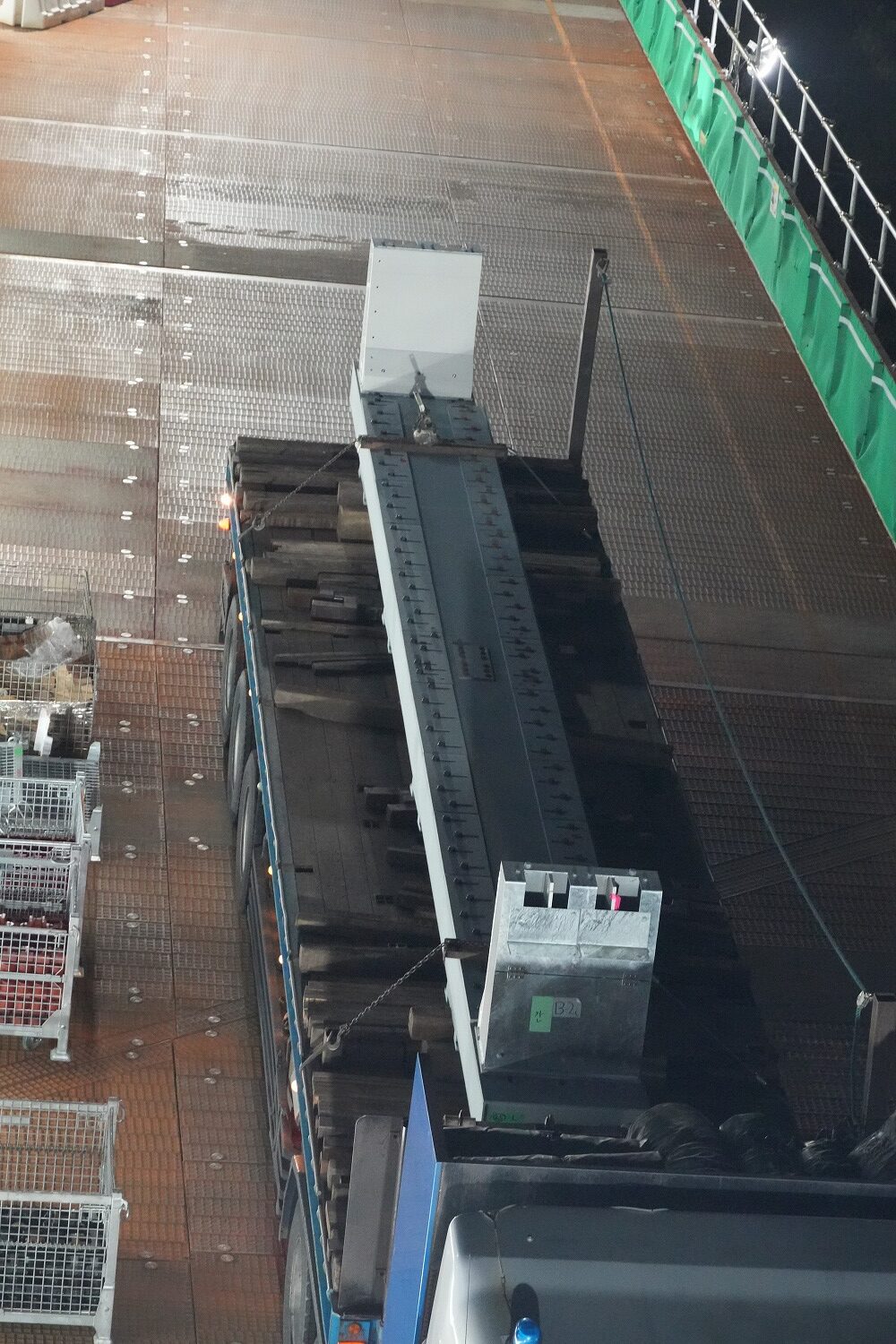 そして集中工事当夜に、仮置きヤードから現場に運送することにした。仮置きヤードから現場までの運搬時間は通行止め区間に入場する正規ルートで40分程度であり、プレキャストPC床版荷下ろし後に撤去した仮設鋼床版の積み込み・運搬を併せた時間であっても、ドライバーの働き方改革の労働時間上限値を十分守ることができるようにしている。これは前述の仮設鋼床版も同じで、JFEの津工場で製作した仮設鋼床版を仮置きヤードまで輸送し、それを中継地点として、現場まで運ぶという工程を繰り返している。STEP1とSTEP2が混在すると既設床版の搬出、仮設鋼床版・鋼製高欄の搬入・搬出、プレキャストPC床版の搬入といったトレーラー作業が錯綜する。そのため、距離を詰めて労働時間に余裕を持たせるための施策である。