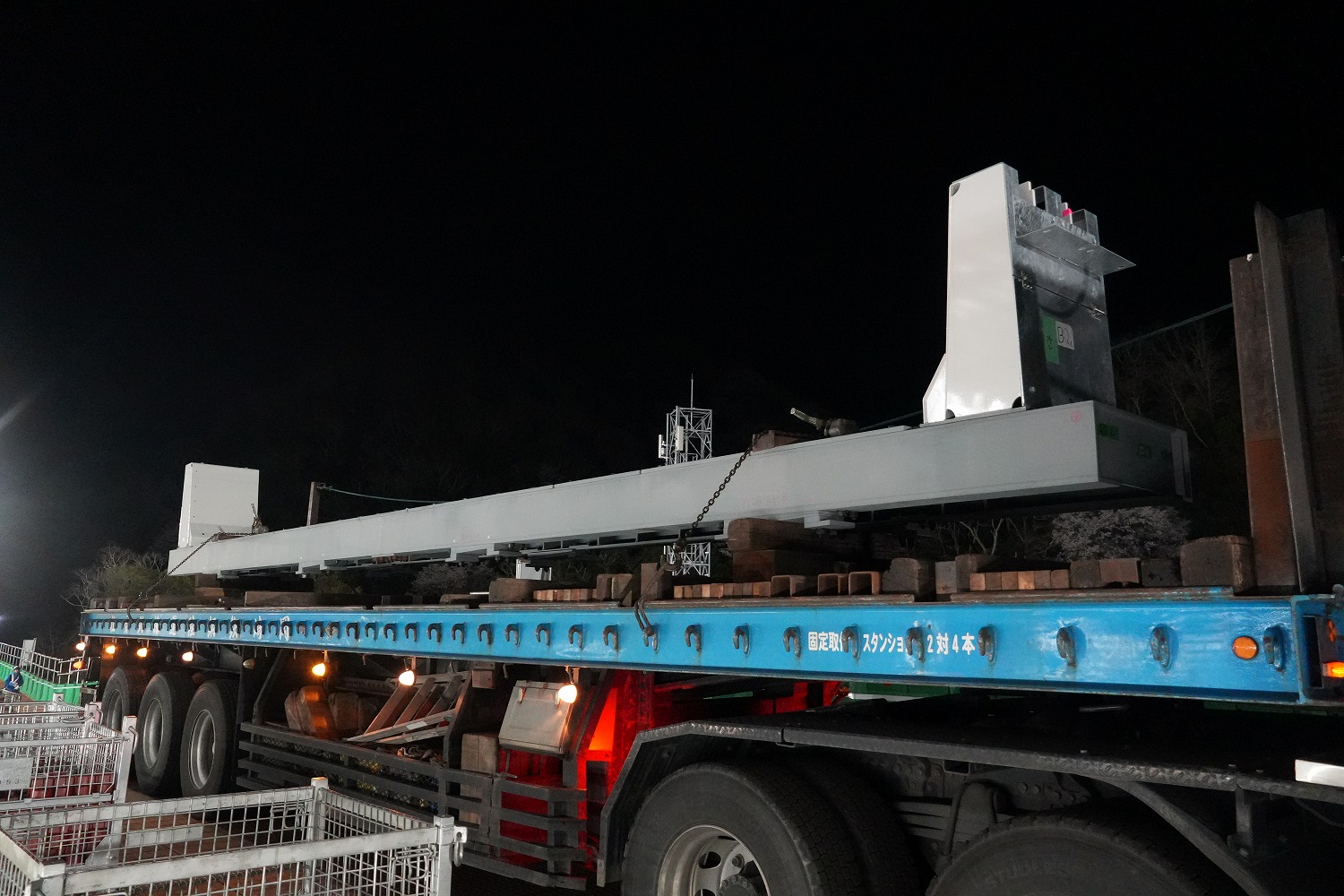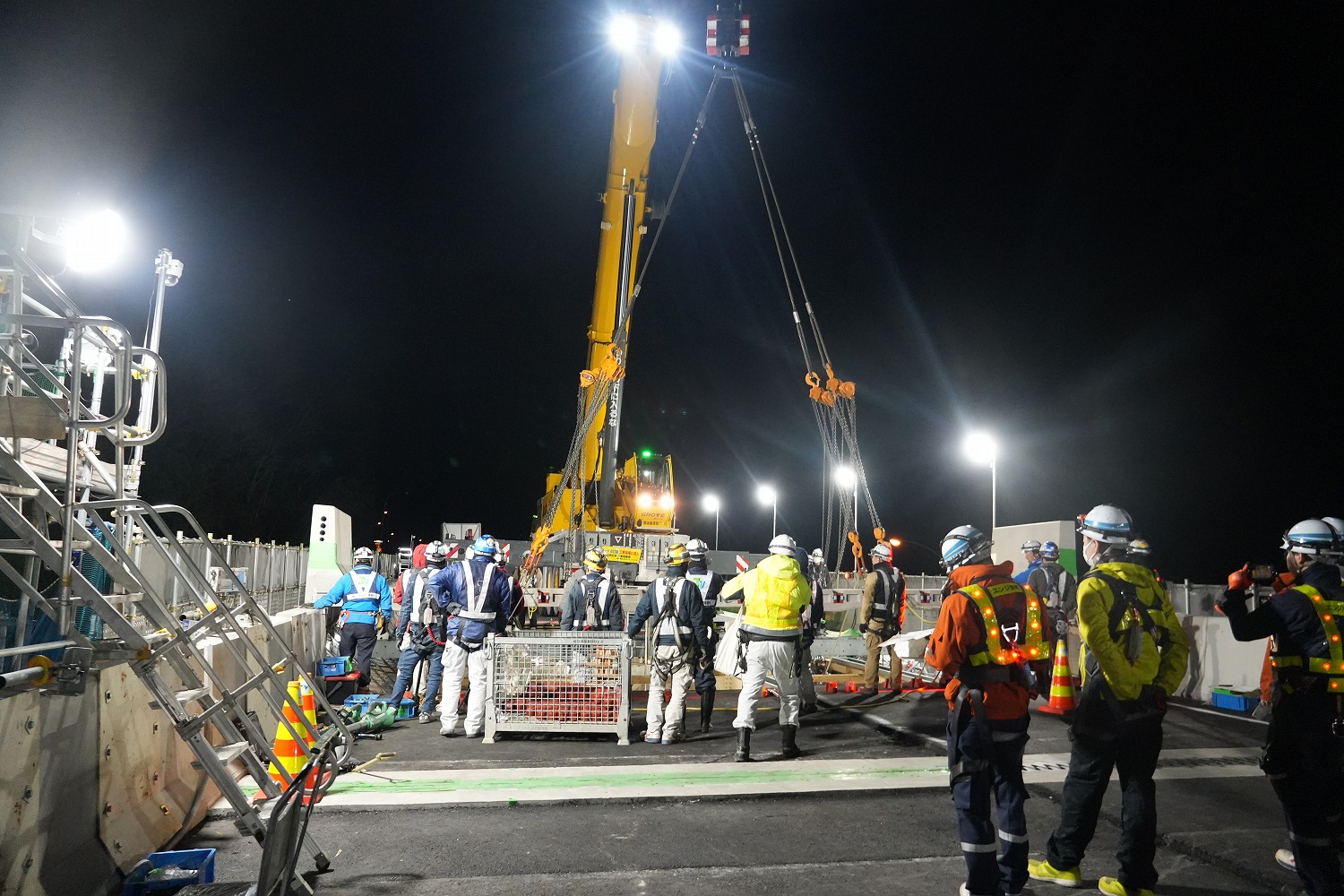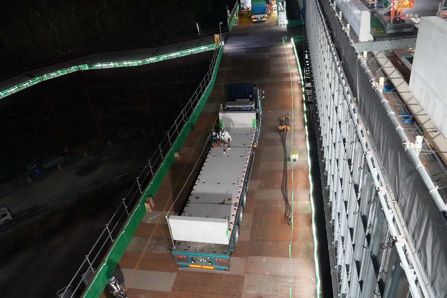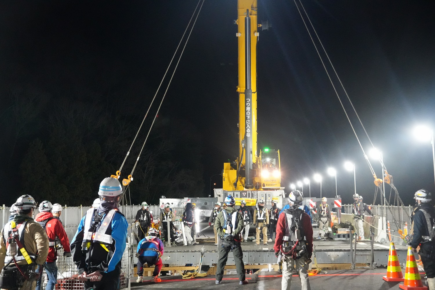 そして集中工事当夜に、仮置きヤードから現場に運送することにした。仮置きヤードから現場までの運搬時間は通行止め区間に入場する正規ルートで40分程度であり、プレキャストPC床版荷下ろし後に撤去した仮設鋼床版の積み込み・運搬を併せた時間であっても、ドライバーの働き方改革の労働時間上限値を十分守ることができるようにしている。これは前述の仮設鋼床版も同じで、JFEの津工場で製作した仮設鋼床版を仮置きヤードまで輸送し、それを中継地点として、現場まで運ぶという工程を繰り返している。STEP1とSTEP2が混在すると既設床版の搬出、仮設鋼床版・鋼製高欄の搬入・搬出、プレキャストPC床版の搬入といったトレーラー作業が錯綜する。そのため、距離を詰めて労働時間に余裕を持たせるための施策である。