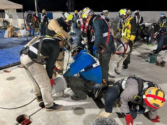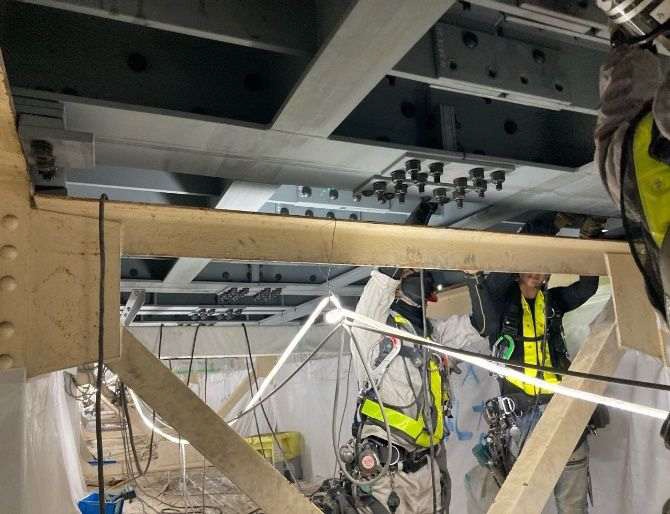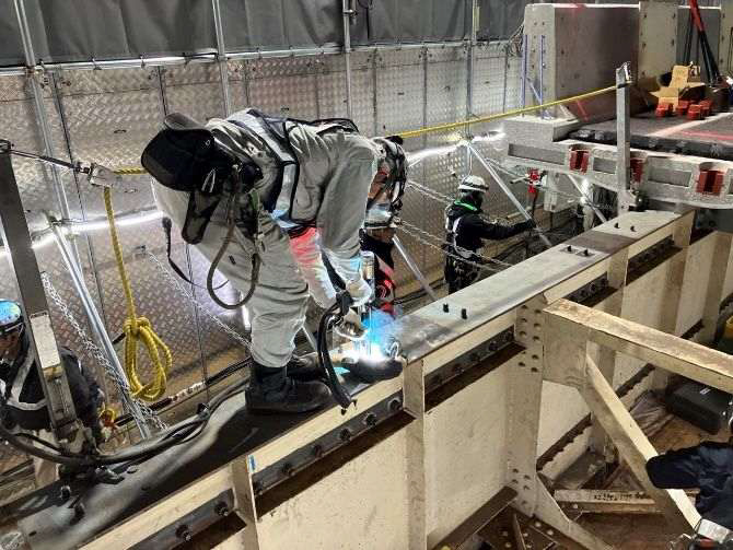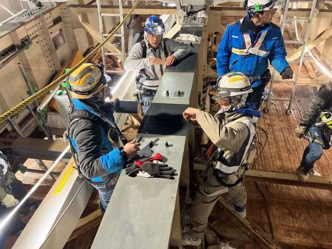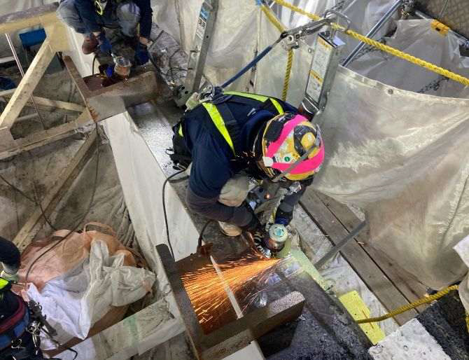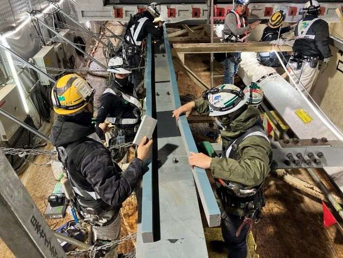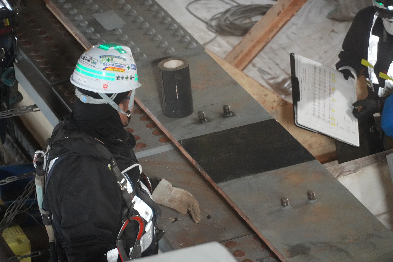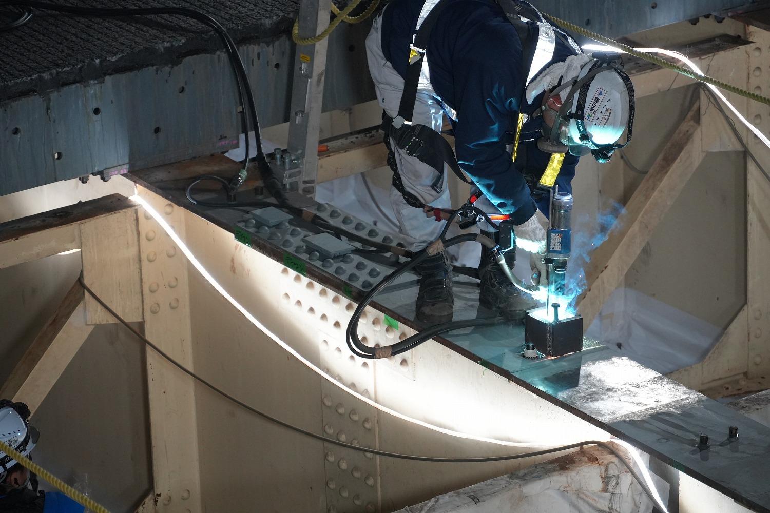 集中工事は例年4月と11月頃の年2回となるため、暑中時期は集中工事に向けた準備作業がメインとなる。具体的には、床版と高欄の一体化、主桁の路下作業(ケレン、スタッド溶接、防食塗装等)、吊足場組替えなど。暑中施工対策としては、空調服の完全着用、スポーツドリンクの無料配布、各作業場所での送風機・ミスト扇風機の設置などを行っている。