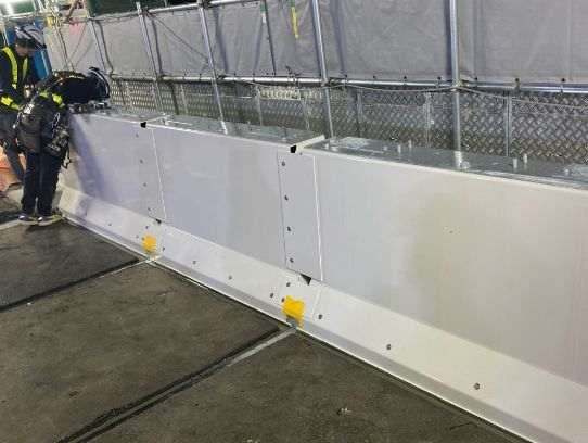 次に、鋼床版を設置するための主桁との接合面(1列に付き4×2支点)の上フランジ上面に研掃を行い、鋼製高欄と予め一体化した仮設鋼床版を半断面ずつ架設していく。研掃においては、主桁ケレン時にグラインダーの火花飛散を養生するため、二重対策を実施(防護板、難燃カーテン)したうえで施工した。