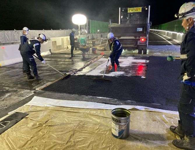 床版防水は前述の通り、施工時間が極めて短い中での施工となるため、GⅡではなく、BLGを用いる。また、表層舗装は、鋼床版上と同様にFFPを用いている。