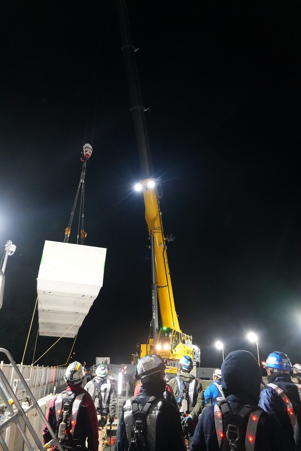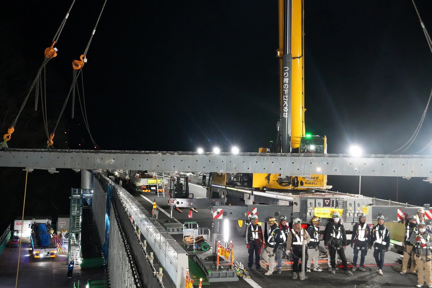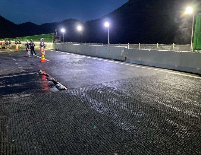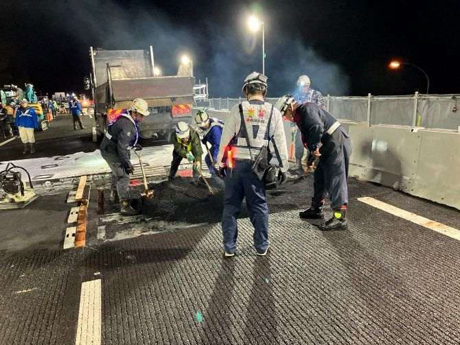 その後、間詰めコンクリートおよび高欄同士をつなぐコンクリートの打設を行い、仮舗装を敷いて、6時に車線開放する。