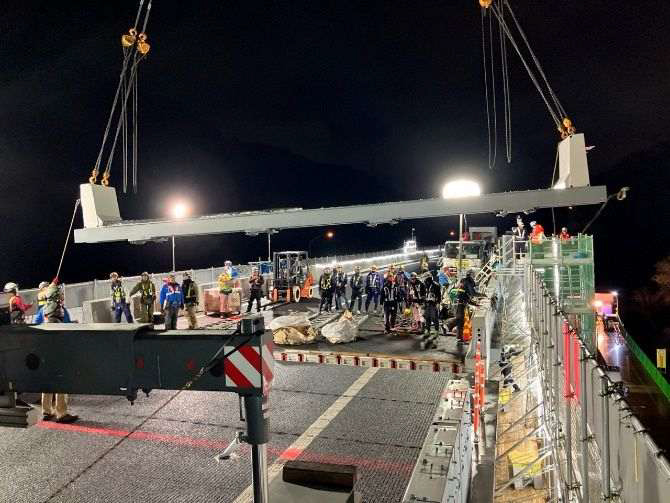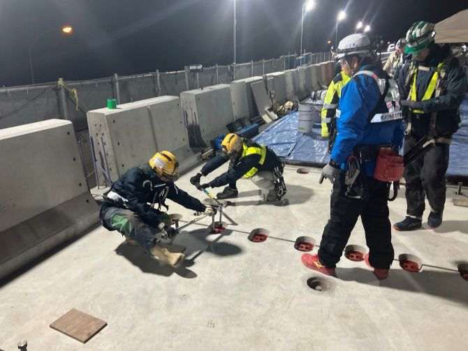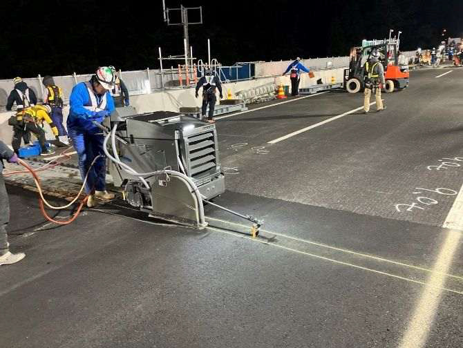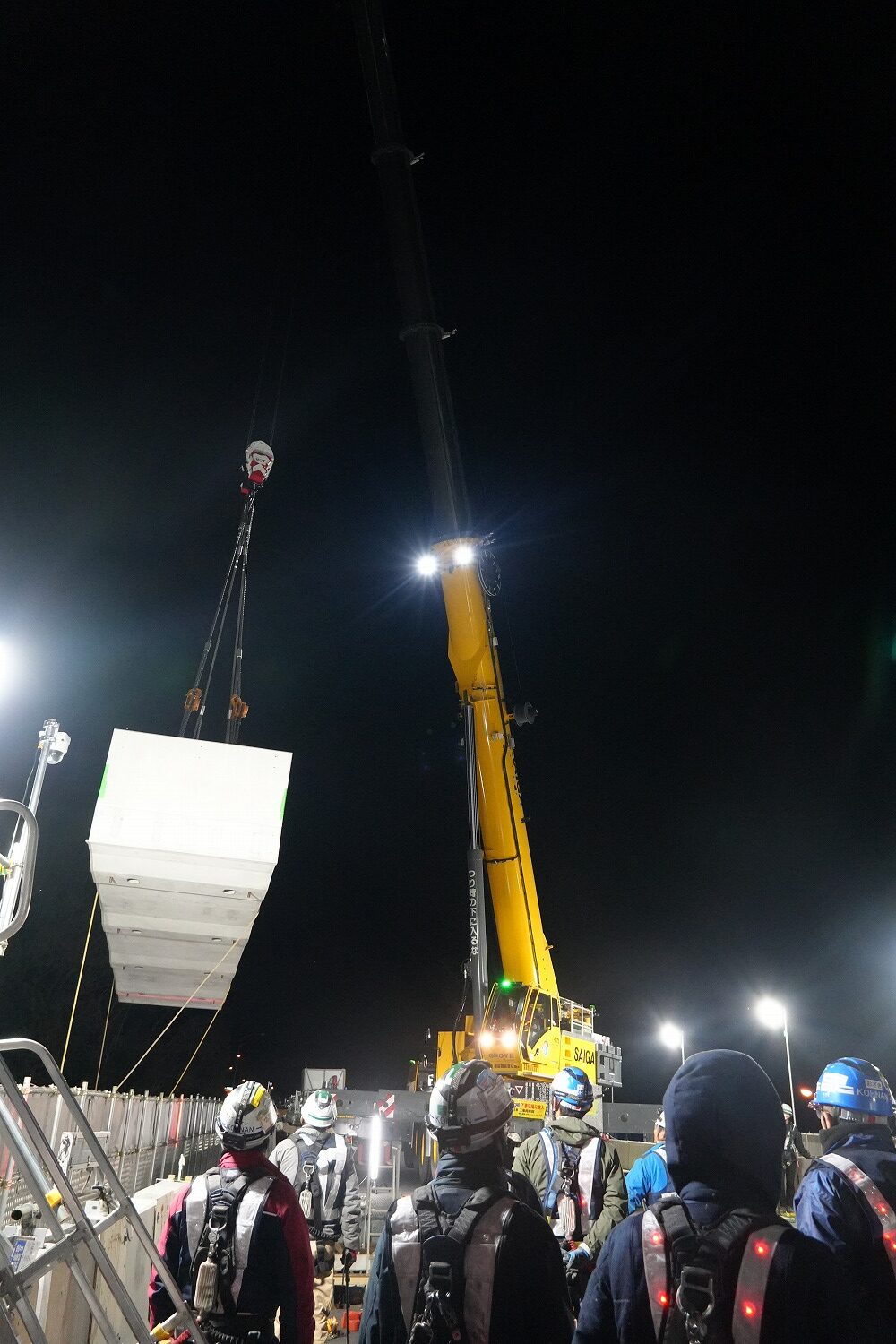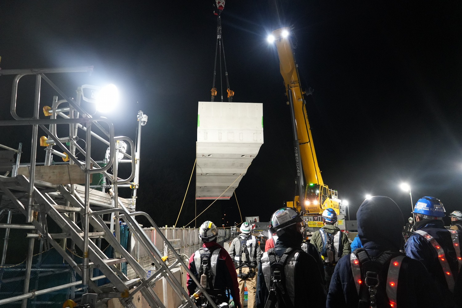 その後、間詰めコンクリートおよび高欄同士をつなぐコンクリートの打設を行い、仮舗装を敷いて、6時に車線開放する。