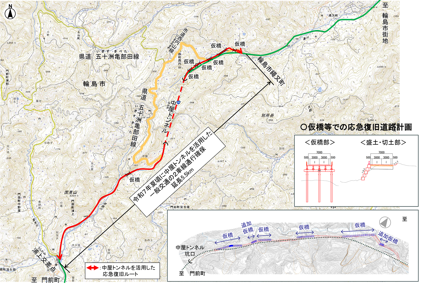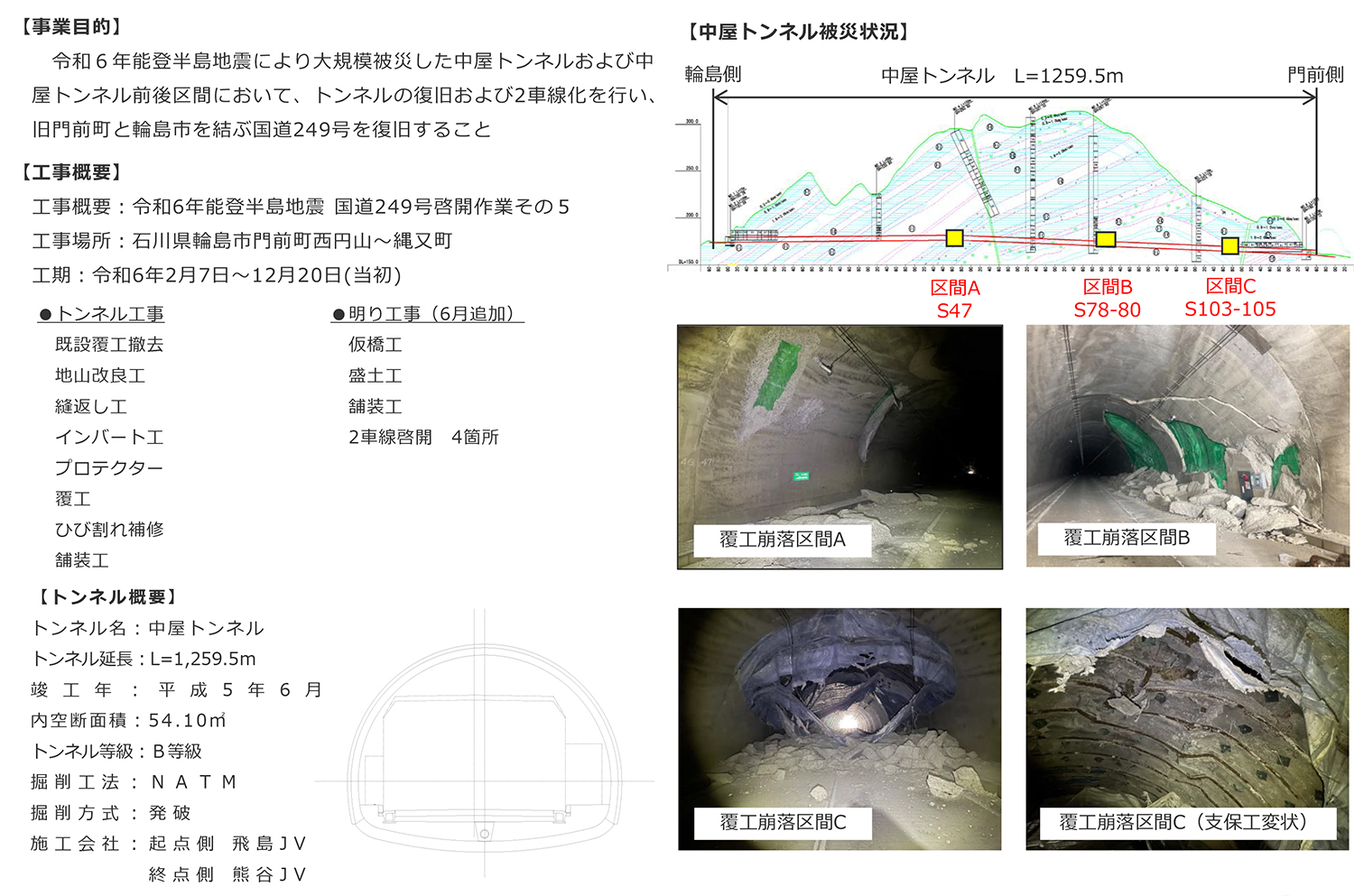 同工事は、令和6年1月1日に起きた能登半島地震によって大規模に被災した中屋トンネル(延長1259.5m)およびその前後区間延長合わせて5.5km(輪島市門前町の浦上交差点から輪島市縄又町)で2車線通行を確保するために行われていたものである。中屋トンネルの損傷は非常に大きく、3箇所で覆工の崩落が見られたほか、支保工の変状に至っている箇所も生じていた。そのため、迂回ルートとして県道五十洲亀部田線と輪島市道西円山切割線 で迂回する形で移動していたが、さらに線形も悪い道路であることから早期のトンネル復旧が望まれていた。