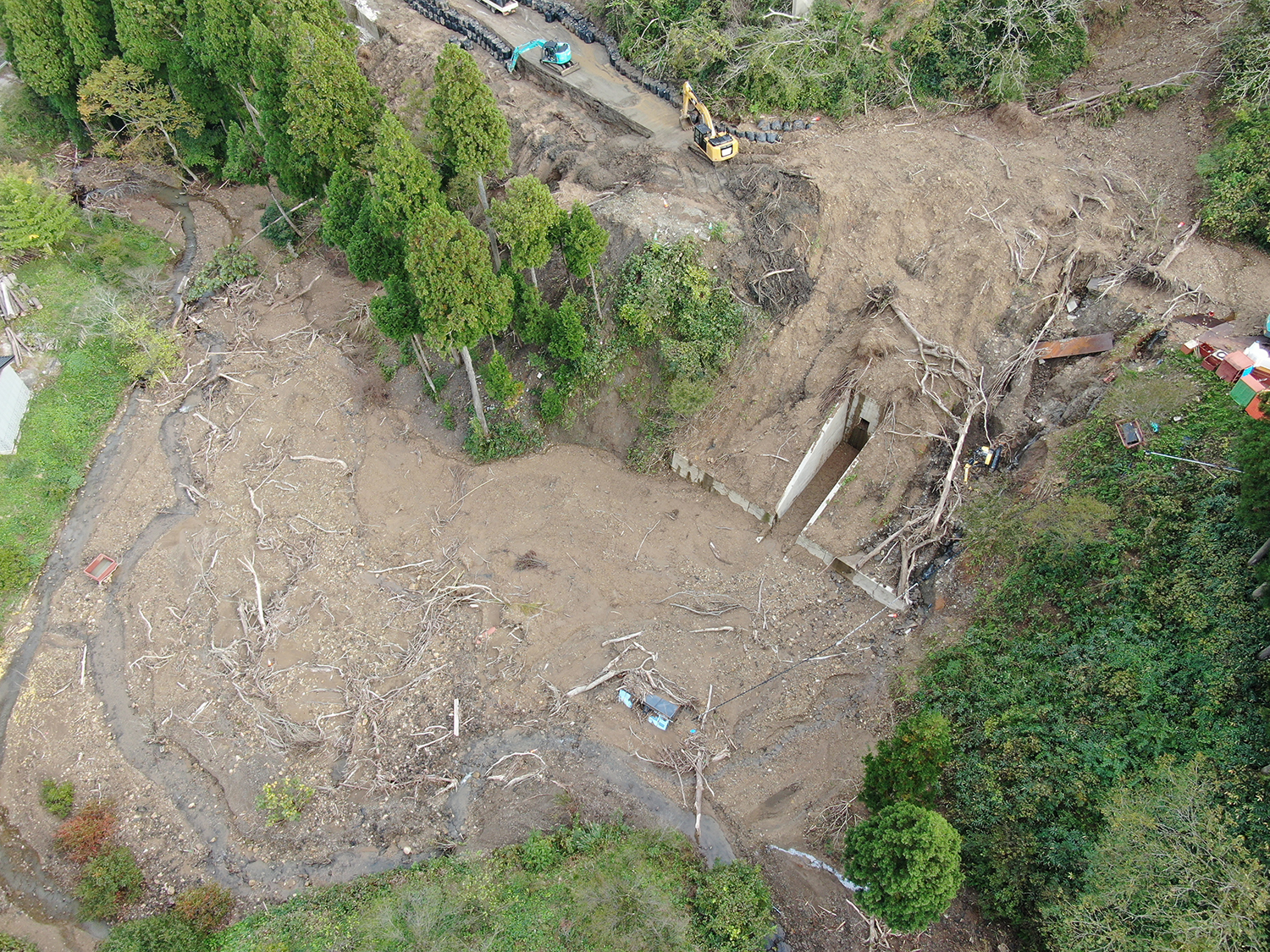9月21~22日にかけて襲来した線状降水帯は、輪島で412mm、珠洲で315mm(いずれも9月21日8時50分からの24h)の雨量を齎し、仮橋や仮設道路の工事場所で斜面崩壊を引き起こし、トンネル~4号仮橋の区間で約5000㎥の土砂が堆積し、トンネル内にも約1,500㎥の土砂が流れ込み、9月25日に予定していた供用を不可能にした。