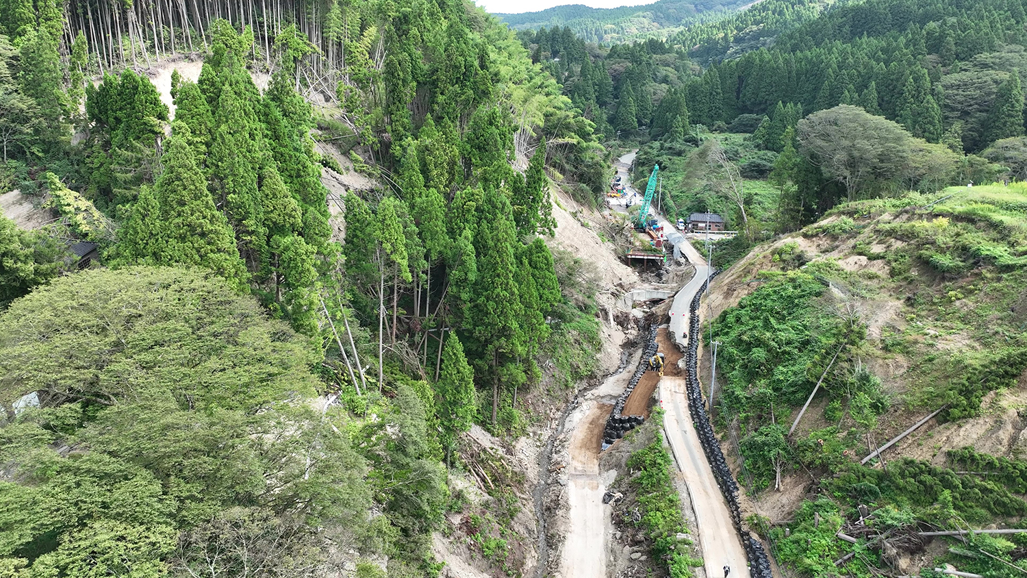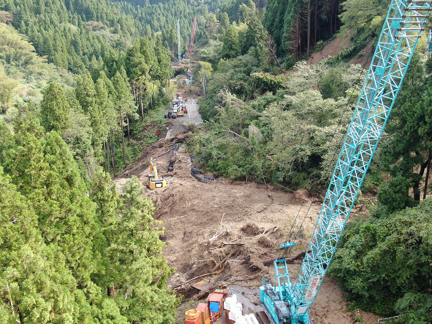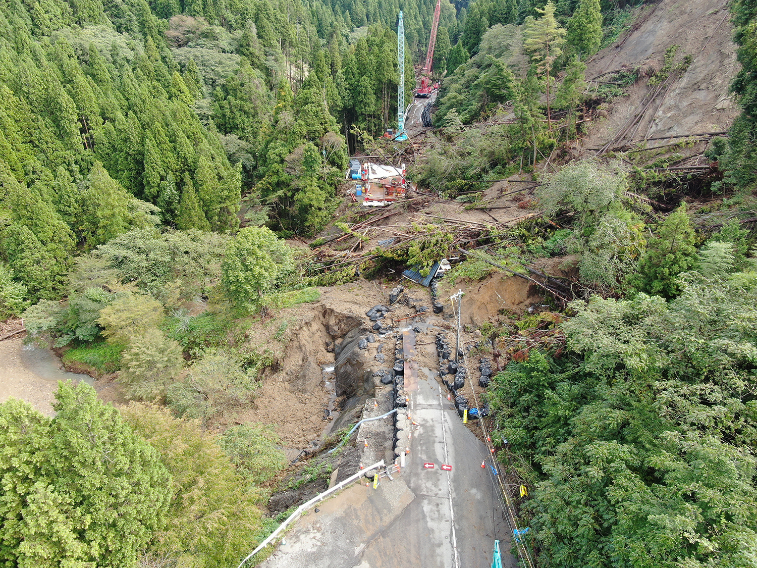 地震から1か月後の2月7日から復旧作業を開始し、復旧作業と並行して、1車線供用をするためのプロテクターも設置し、昨年9月下旬には片側交互通行で通行確保する予定で、同12月には2車線供用するつもりであった。そこを襲ったのが、同9月下旬。まさに1車線供用する直前に襲った豪雨水害である。
