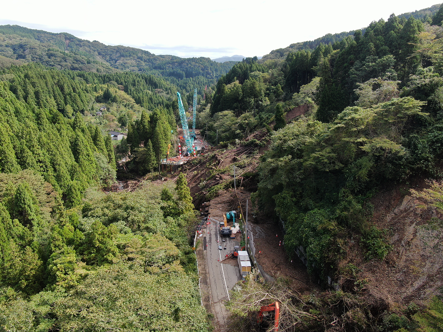トンネル部については、2カ月弱で内部の土砂を除去した。しかし、仮橋・仮設道路の早期完成が崩積土によってほぼ不可能になったため、片交による供用を諦め、2車線での供用を目指すべく、対策工法を検討し方針を変更した。