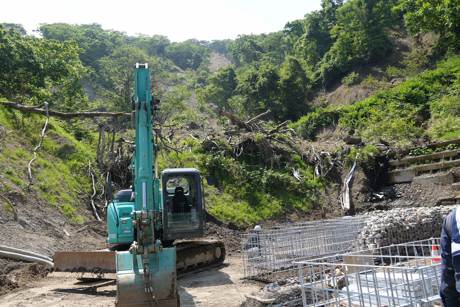 5000㎥に達する崩積土を掘り返して除去し、仮設道路を再設置した後に仮橋工事を再スタート