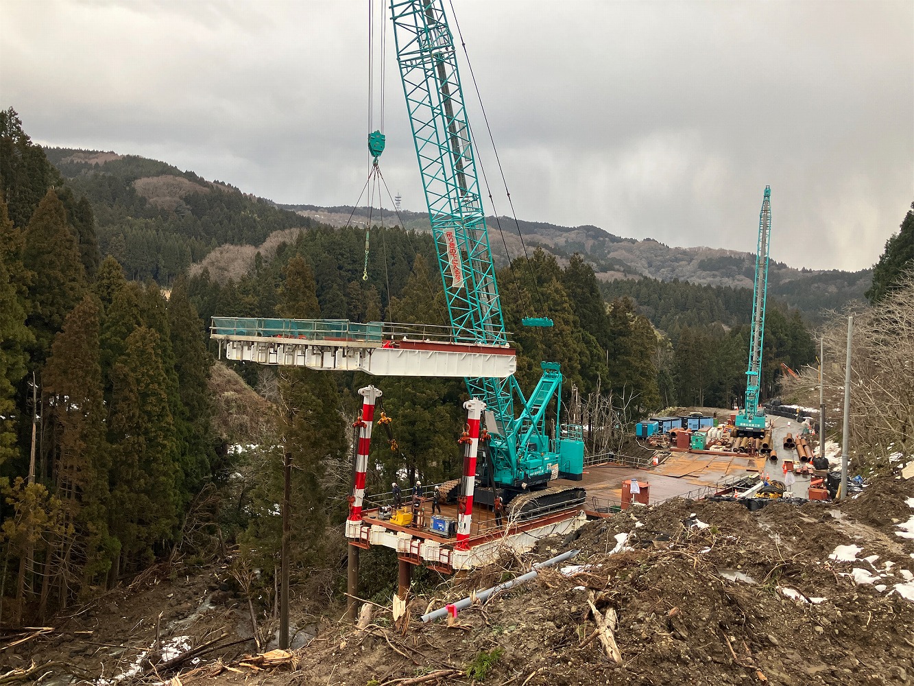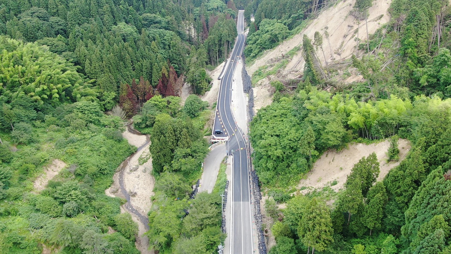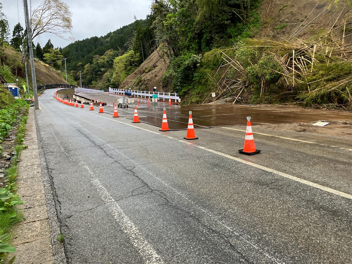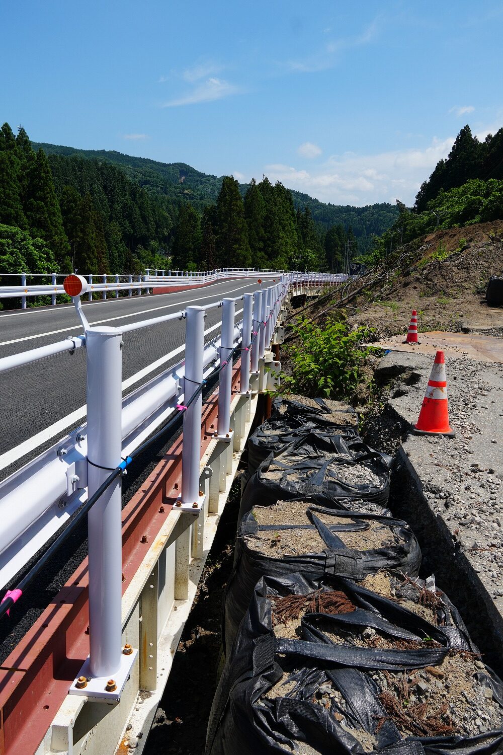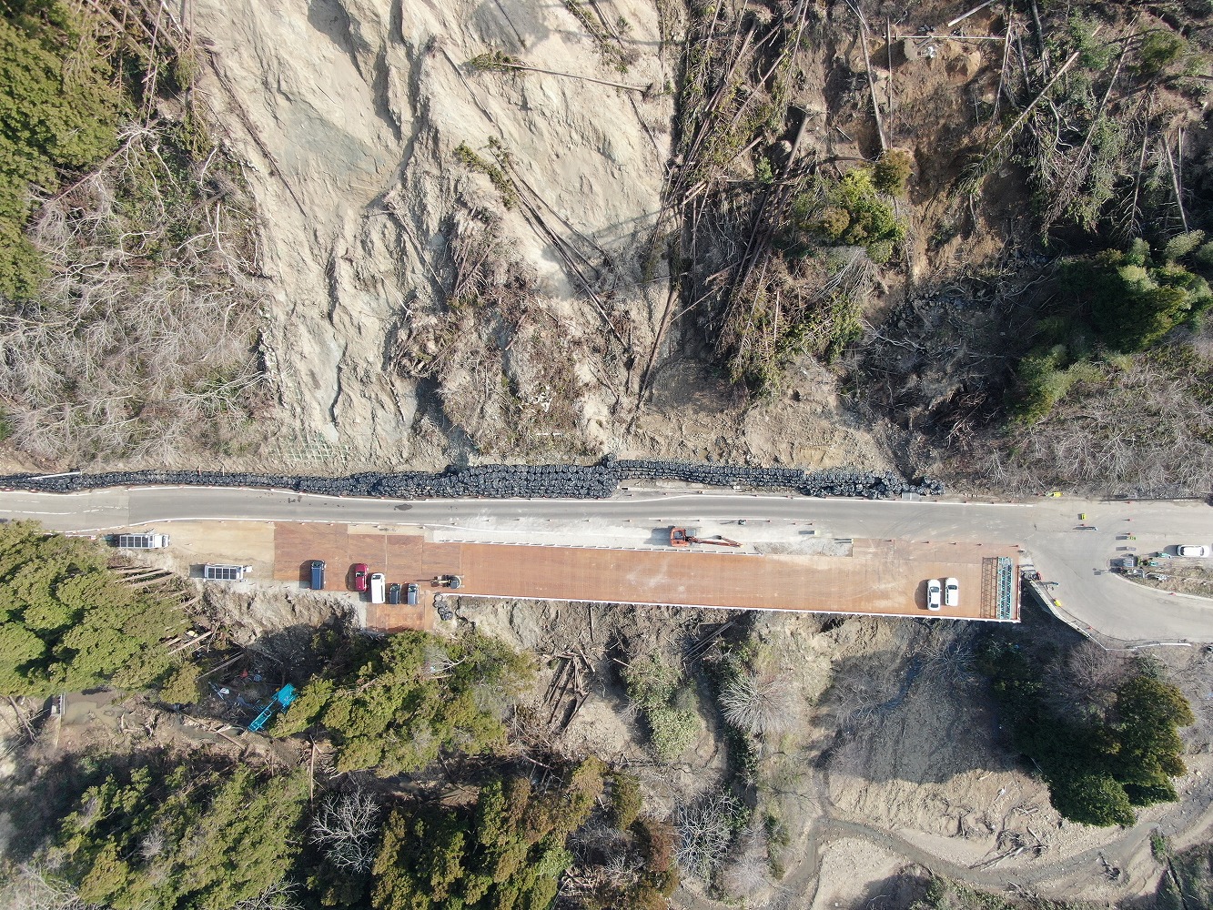 5-40の仮橋、仮設道路でつなぐ区間の既存道路は、24年元日の地震時に地すべりにより道路が崩壊し通行不能となった。その後、仮設道路で通行できるようになっていたが、これが9月下旬の豪雨で寸断された。仮設道路は24年12月までに寸断された箇所の補修を終えた。