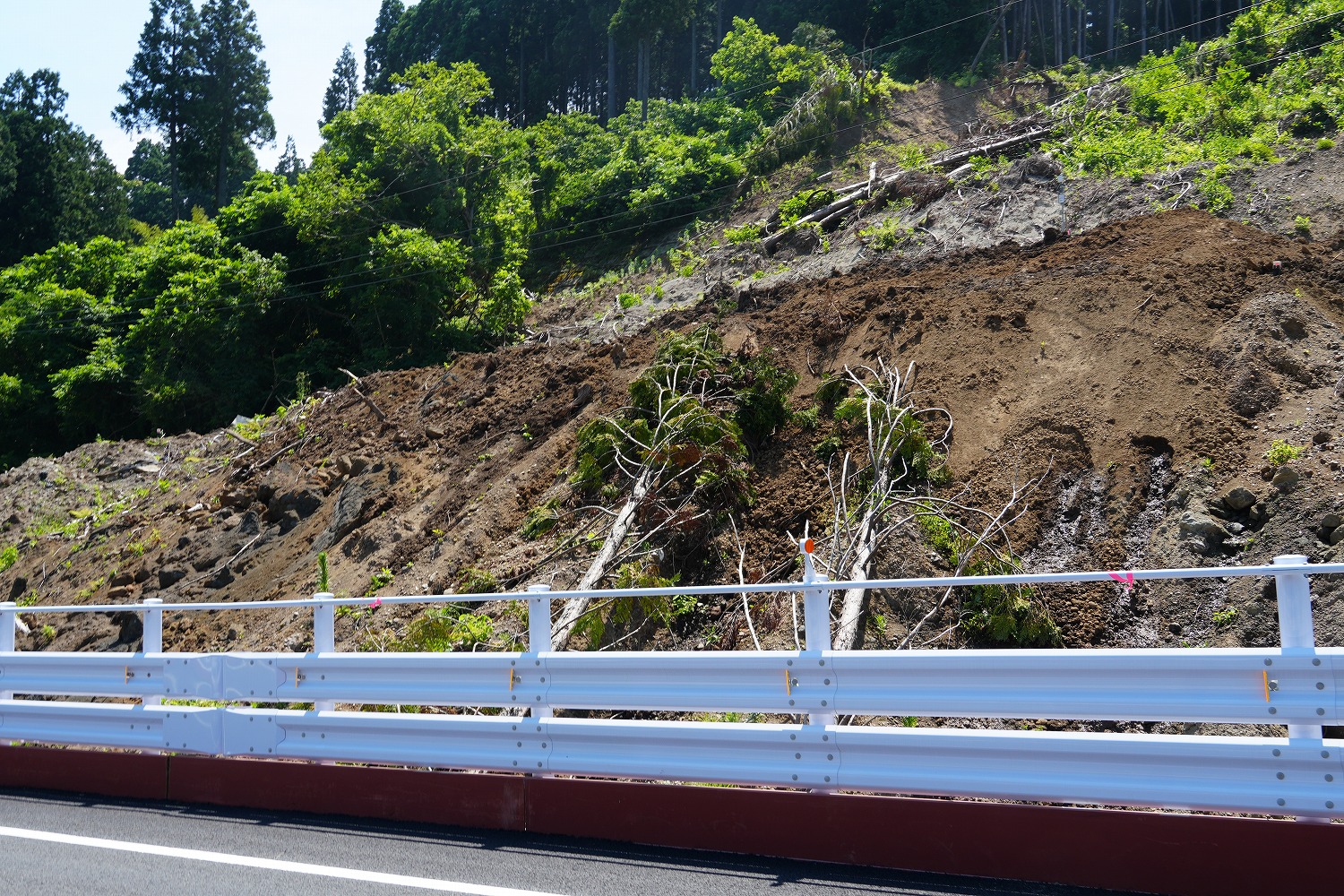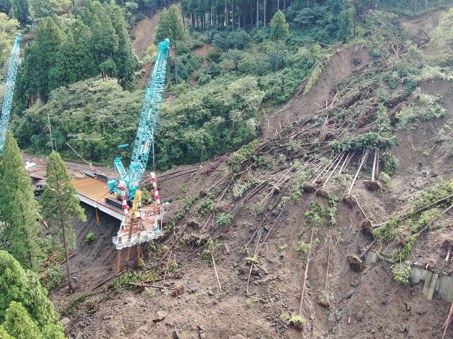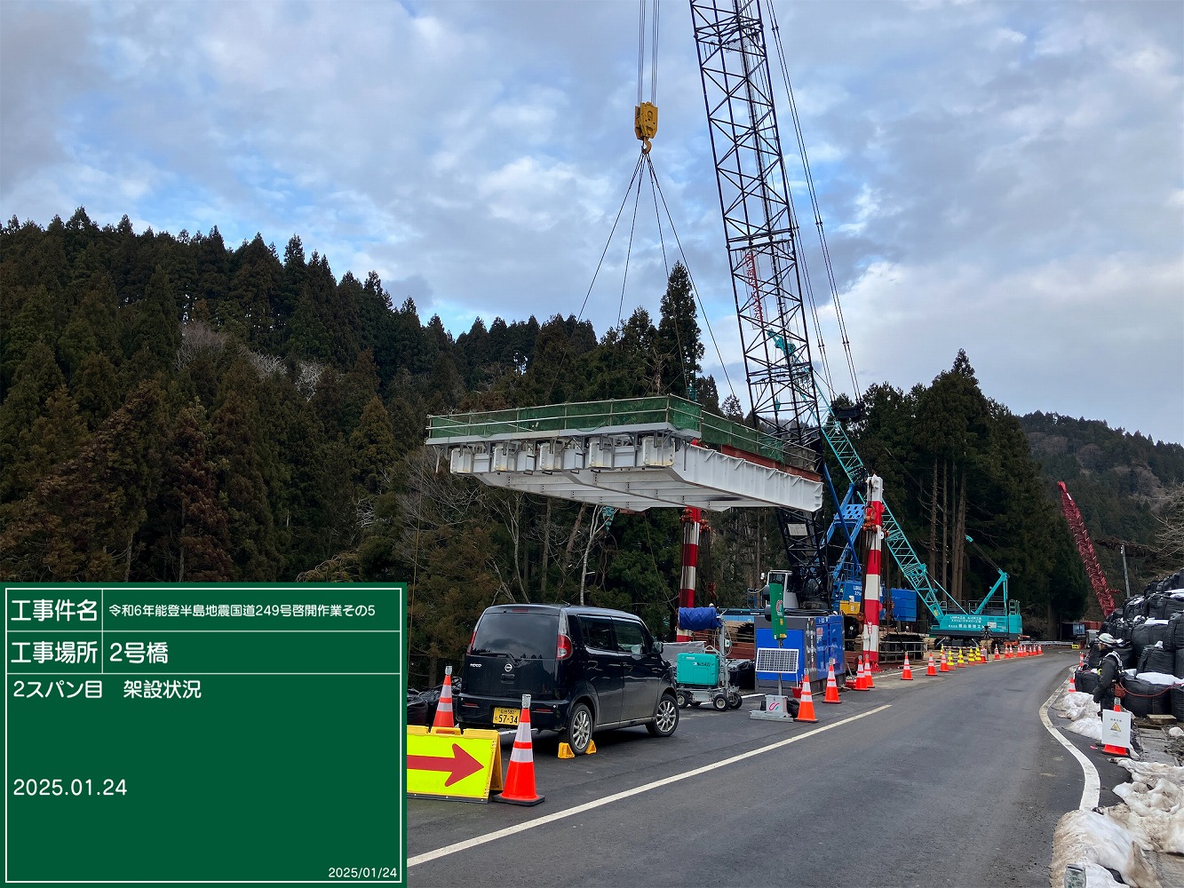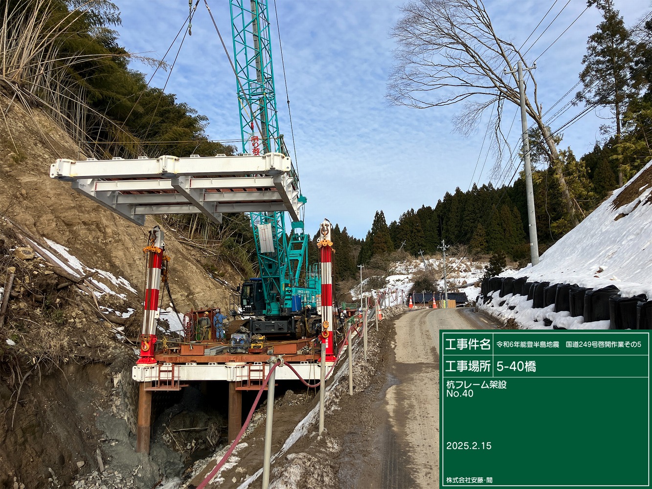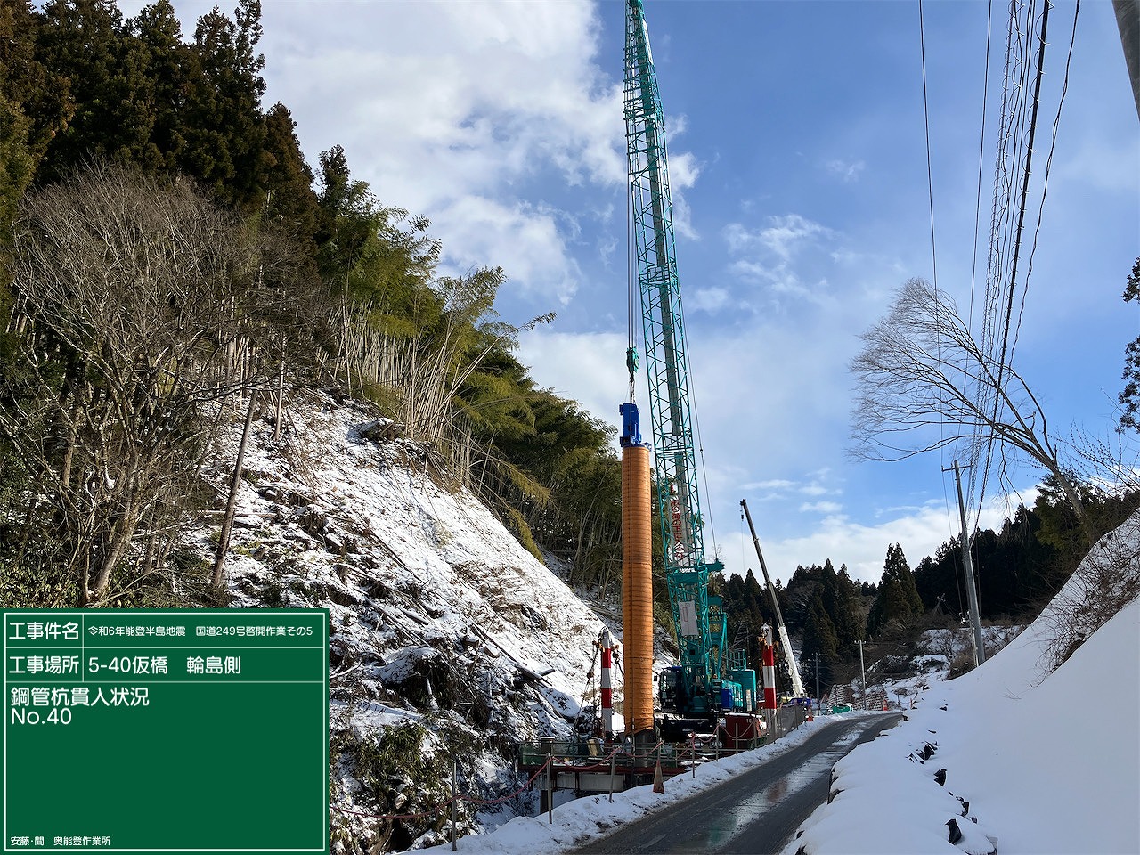 5-40の仮橋、仮設道路でつなぐ区間の既存道路は、24年元日の地震時に地すべりにより道路が崩壊し通行不能となった。その後、仮設道路で通行できるようになっていたが、これが9月下旬の豪雨で寸断された。仮設道路は24年12月までに寸断された箇所の補修を終えた。