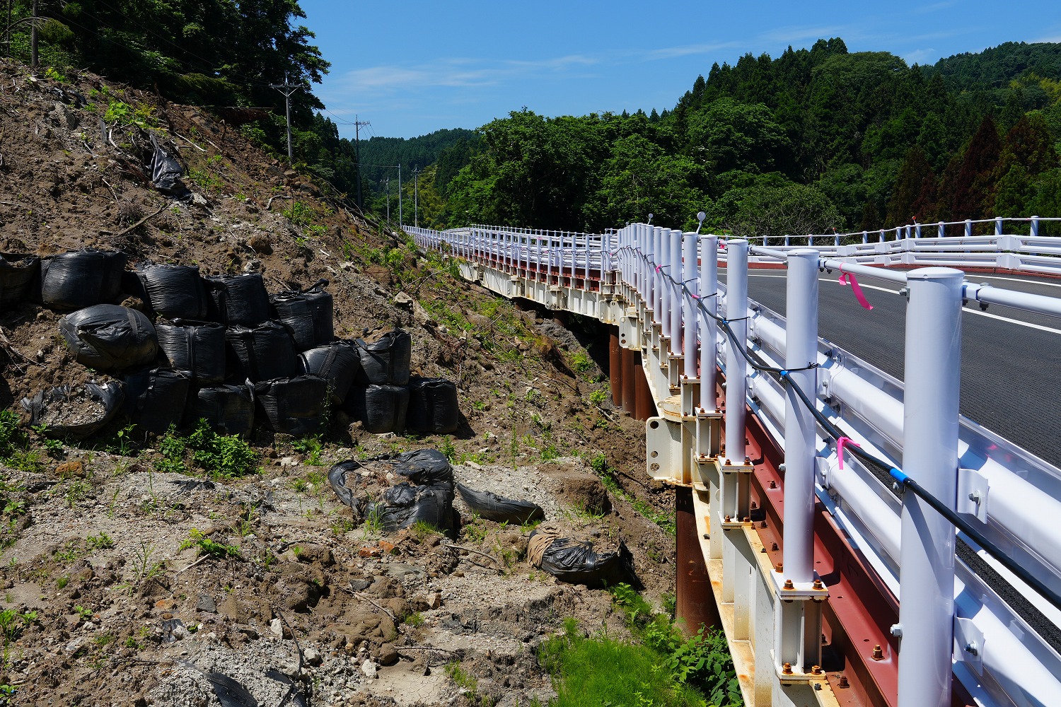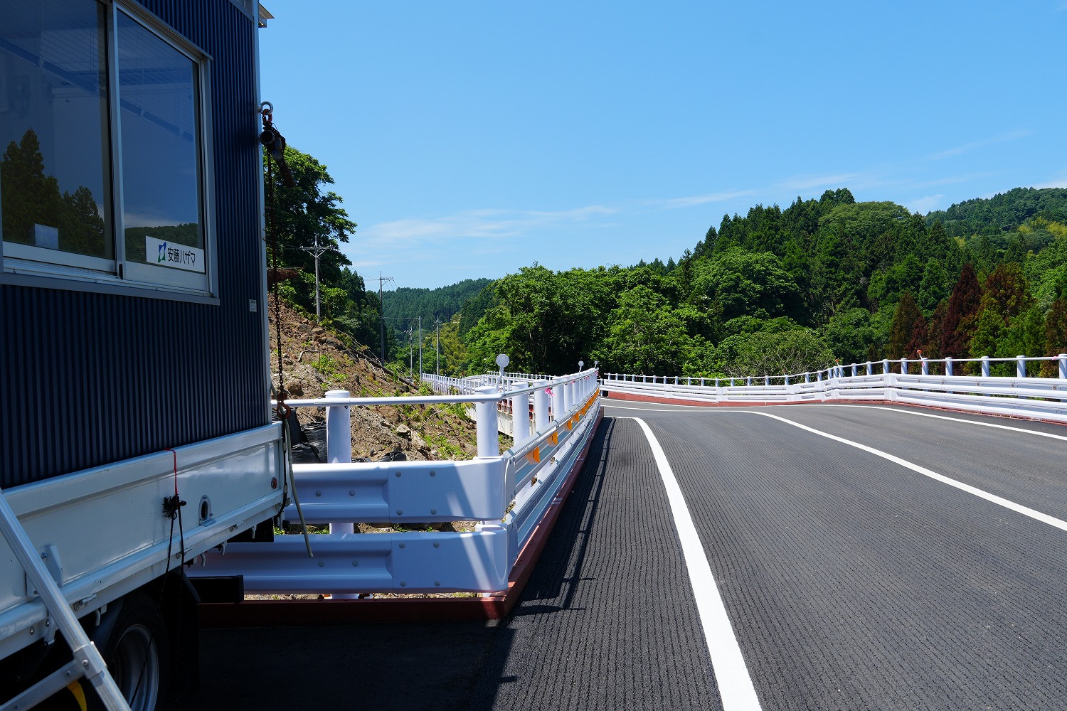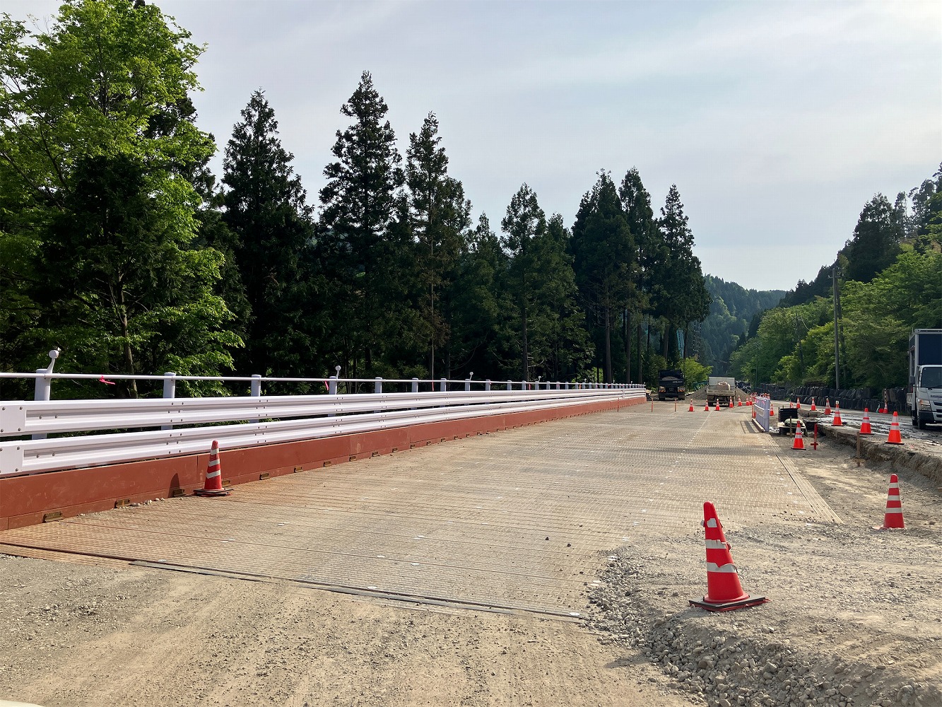 3号橋は地震の影響で現道が一部崩落したため、崩落個所を繋ぐべく、橋長65mの仮橋を架設した。ここは豪雨の影響はなく、「施工も苦労せず架けることができた」(安藤・間)。