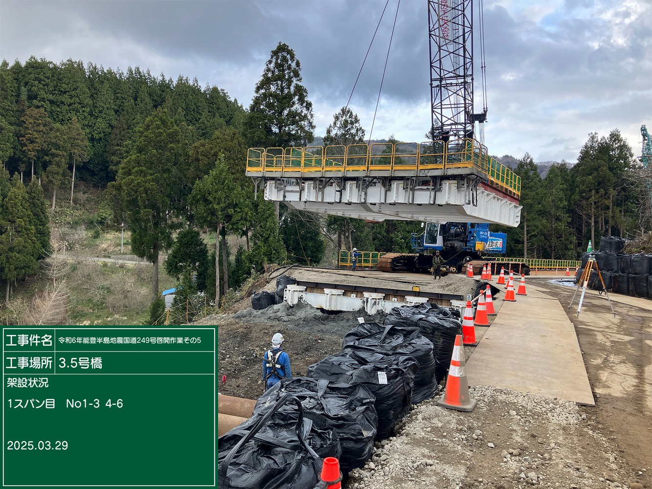仮橋は全部で7橋が架設された(1号橋を除く5橋はいずれもLIBRA)。門前側に1橋、輪島側に6橋である。施工中であった2橋と門前側の5-40橋に隣接する仮設道路(盛土工)は豪雨の影響を蒙った。
