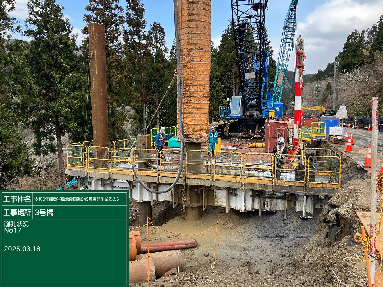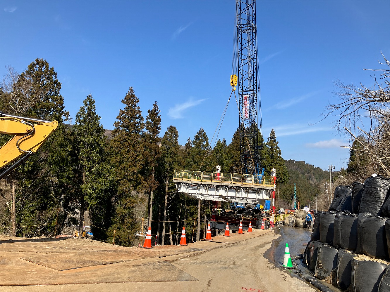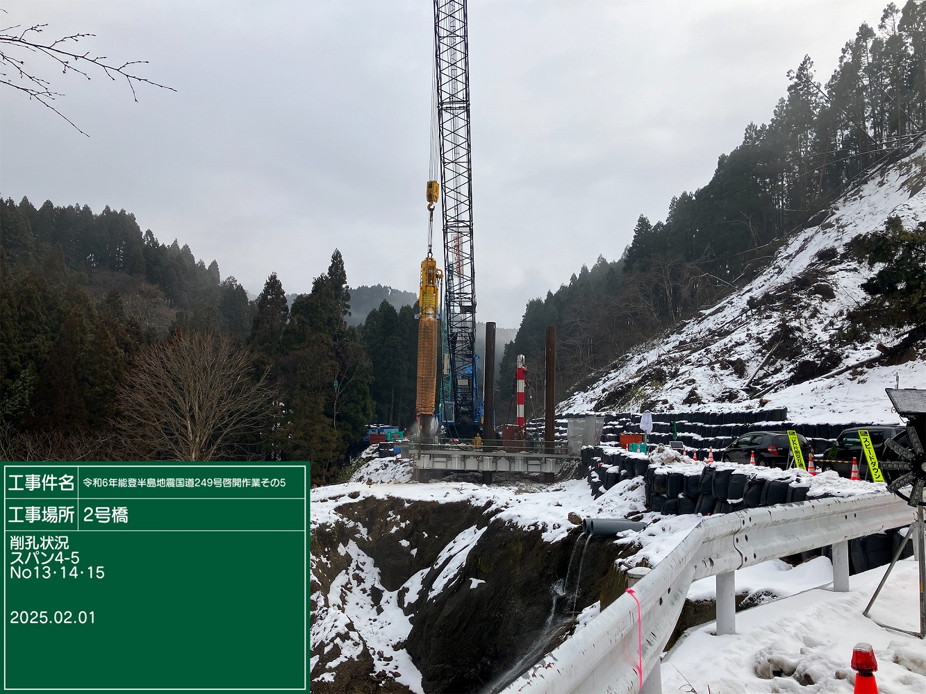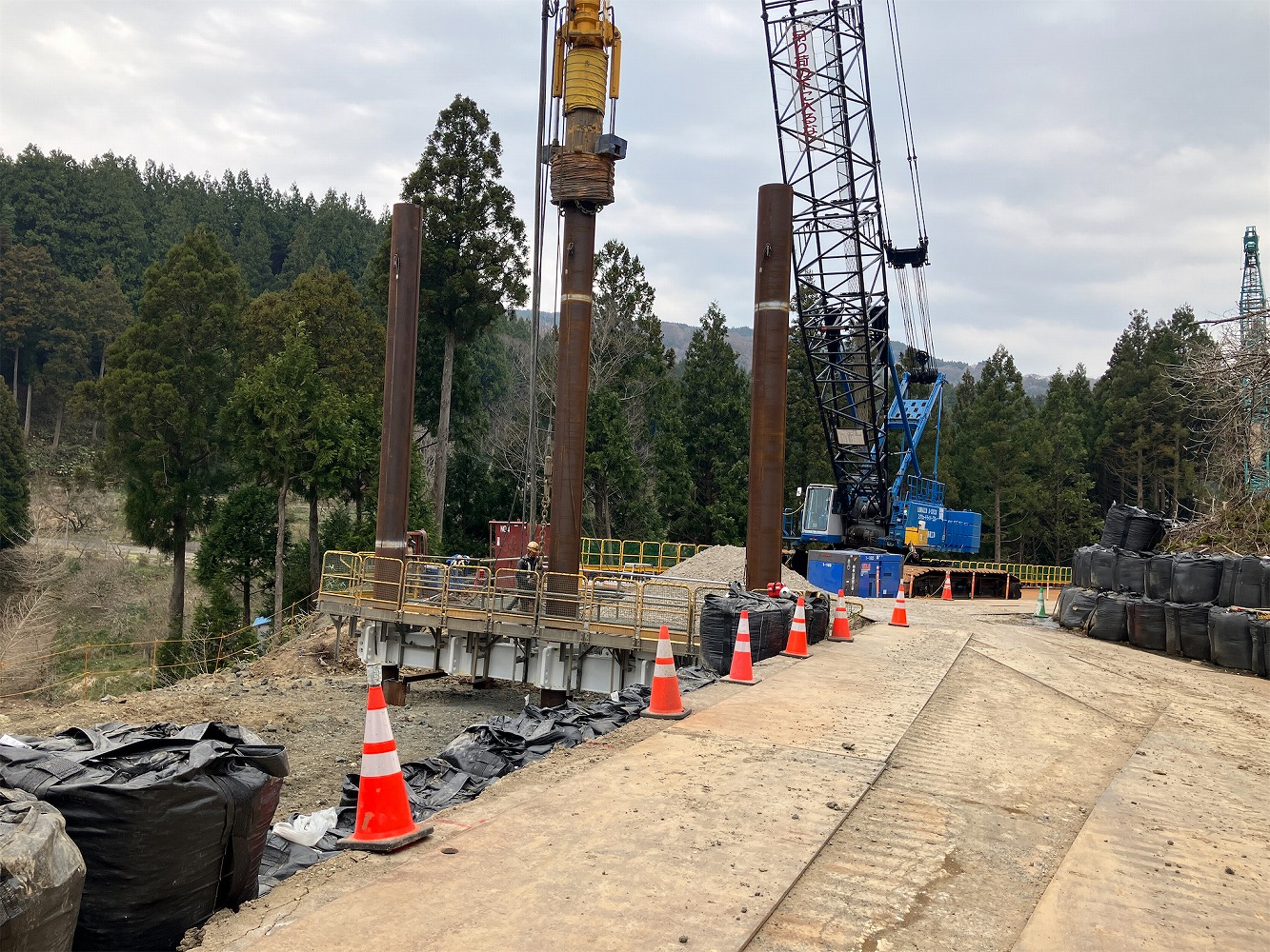 仮設道路は2号橋の脇に設置されていたが、ここも豪雨による崩積土で完全に埋まった状態になった。そのため、5000㎥に達する崩積土を掘り返して除去し、仮設道路を再設置した後に、改めて仮橋の架設を2025年1月から再スタートさせた。なお他3橋もスパン長は12.5m、杭径はφ600、杭高さはGL-10~20mとおおむね一致している。