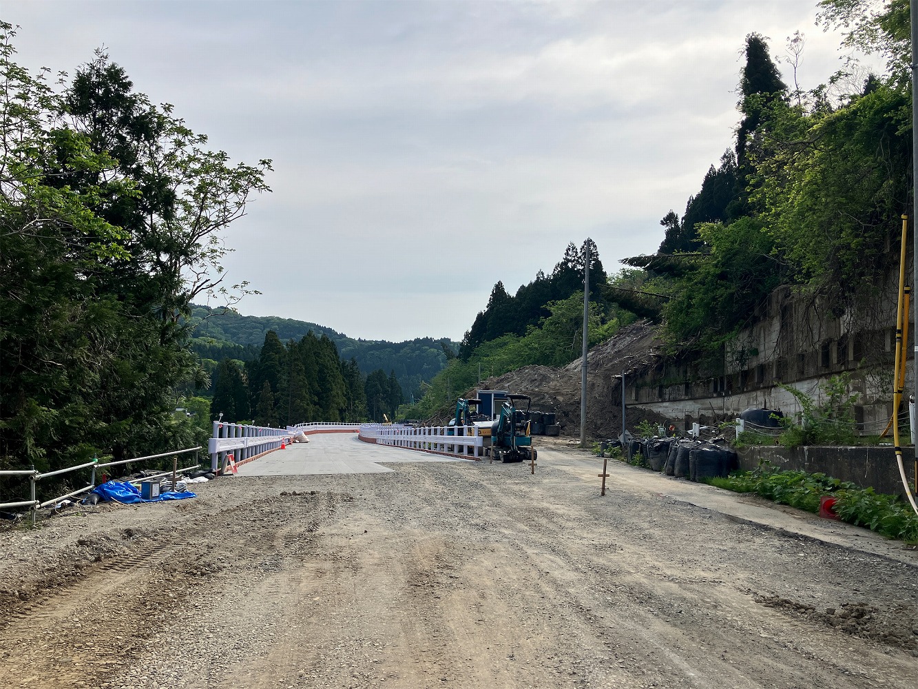 なお、同箇所は山側にも仮設道路があったが、豪雨で完全に跡形もなくなった。そのため、この新しい橋をかけるまでトンネル側には、歩いてしか近づけず、完成後初めてトンネル内部へ車両による資材搬入や人の移動ができるようになった。