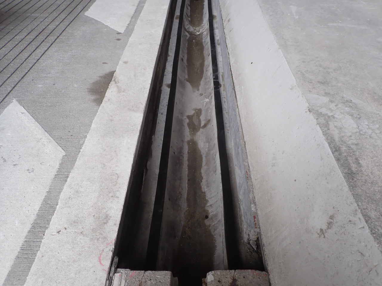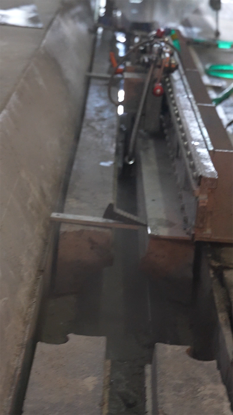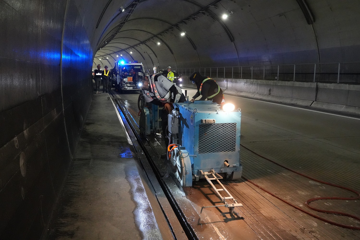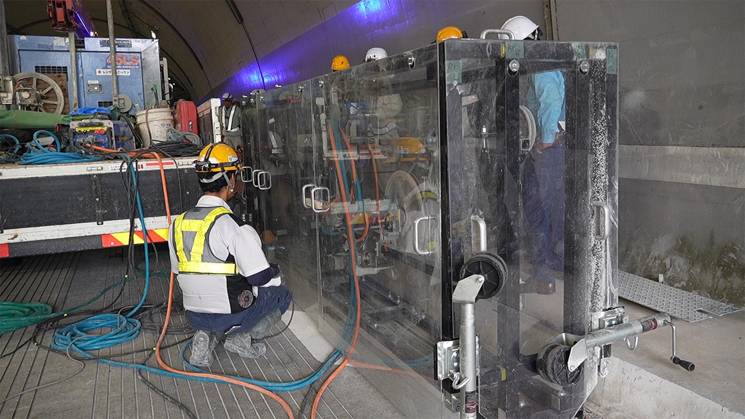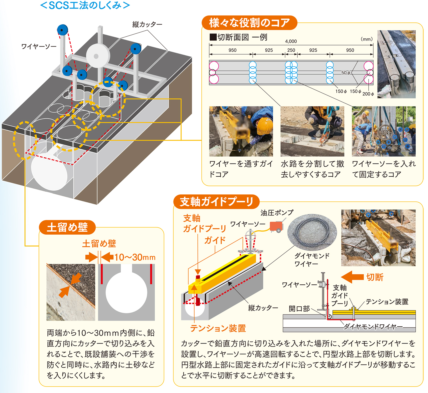 阪神高速技術とナガタ工業は、ワイヤーソーによる円形水路補修技術『SCS工法』を開発し、阪神高速道路北神戸線の金仙寺トンネルで初めて本格的に適用した。テンションをかけたワイヤーソーを用いて劣化した円形水路の上面(高さ160mm)を引き切りすることで、損傷していない円形水路の下部のマイクロクラックを抑制し切断。その上にプレキャストRC製の蓋を付けることで、円形水路の健全性を回復させるもの。1台に付き1日当たり8~12m程度の施工能力を有する。円形水路上部のRC製の蓋は車両の荷重による破損の可能性を考慮し、従来の軸方向に溝が連続するタイプから、中間にリブを有するタイプとした。荷重に対する強度を確保しつつ、開口部の幅を従来の50mmから100mmに拡大させ、手を入れられるようにすることで水路内の滞留物を除去できるようにしている。その現場を取材した。