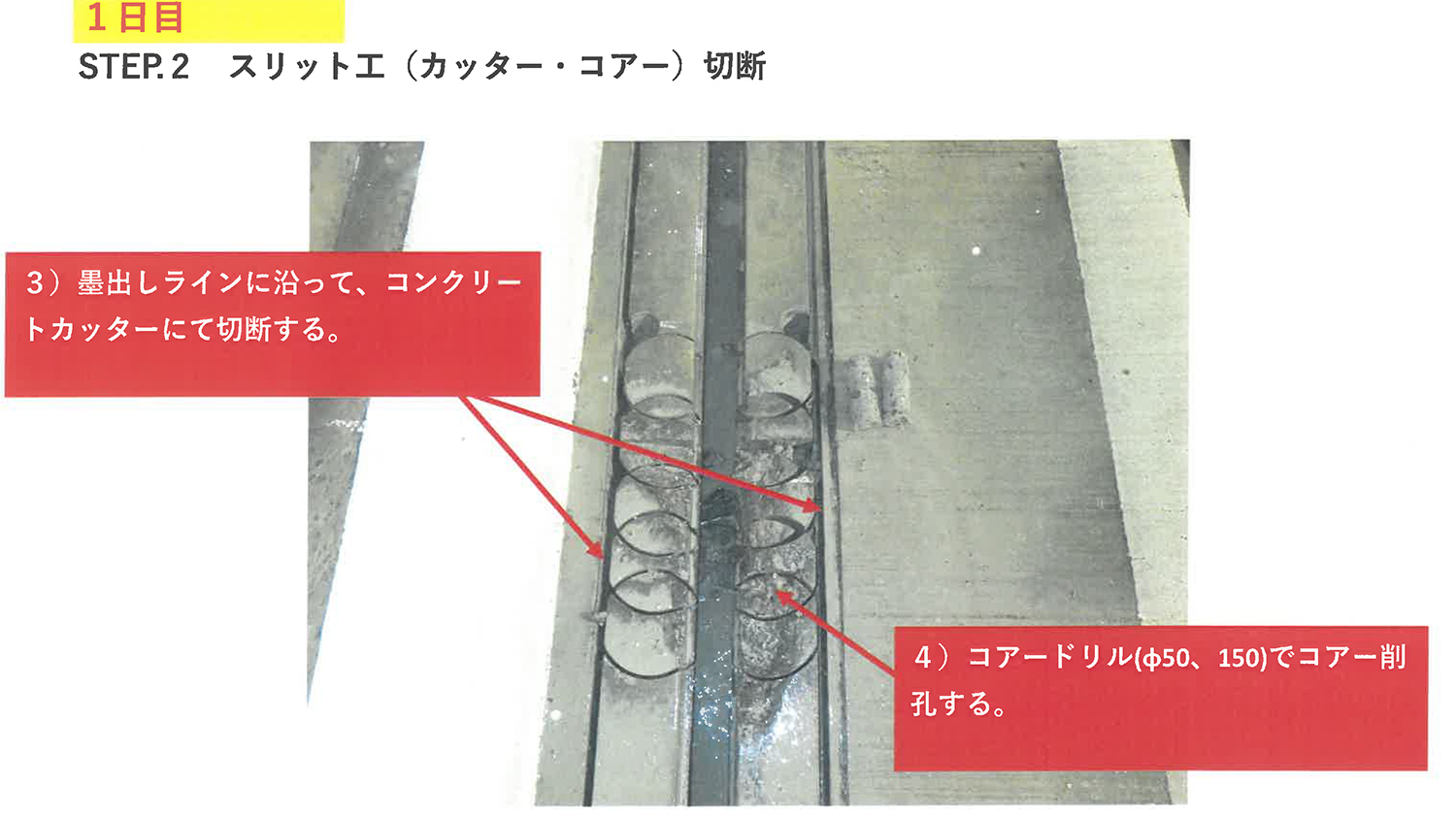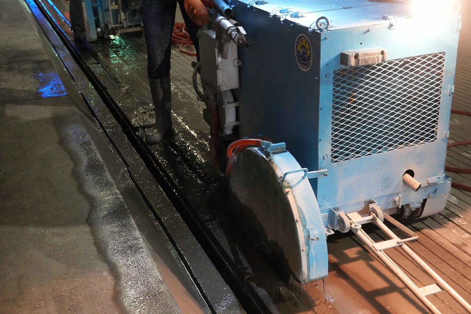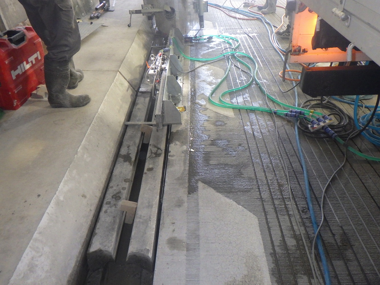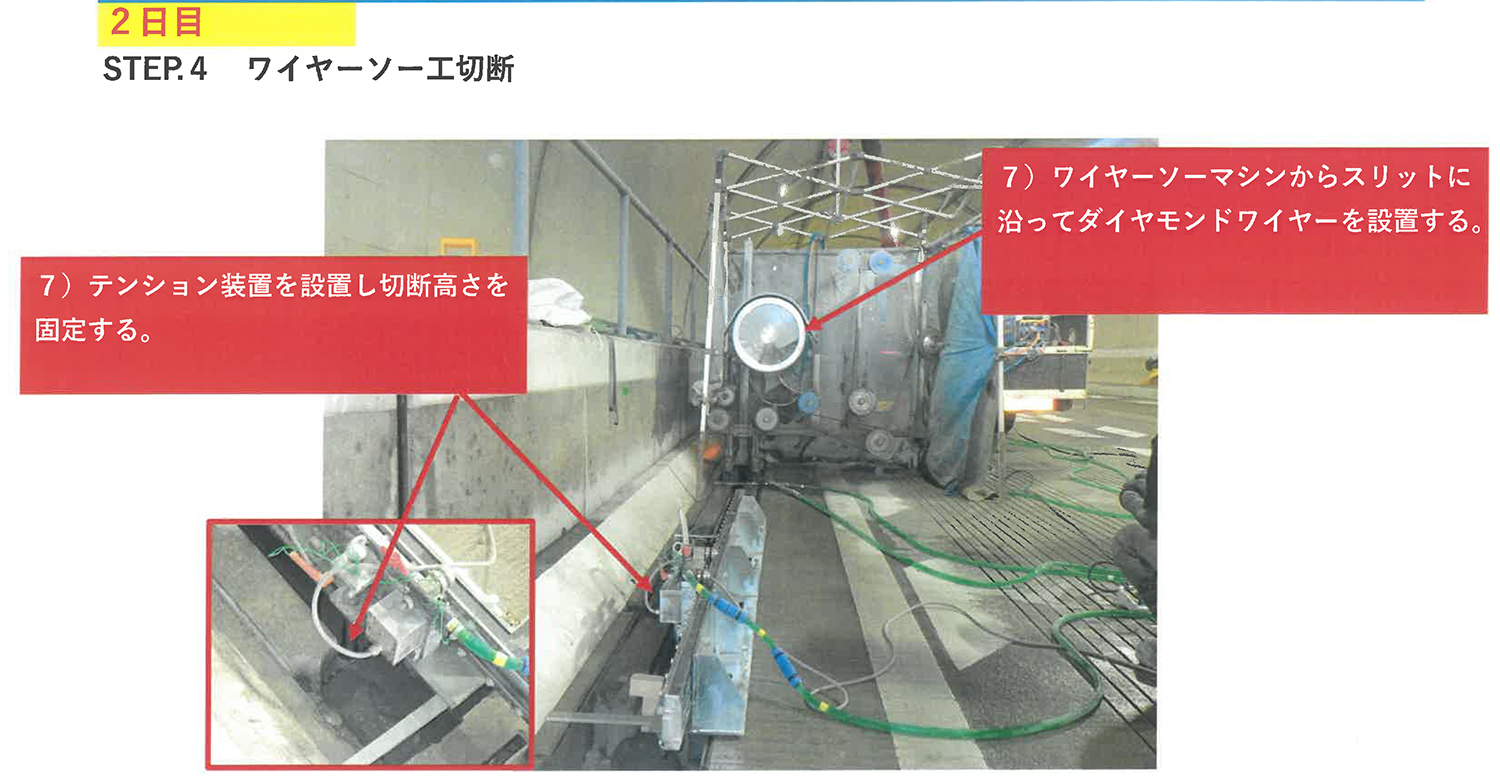 ワイヤーソーの施工は1セット当たり長さ4mの切断が可能で、ロードカッター施工からワイヤーソーでの切断までの作業を1日当たり2~3セット、8~12m施工できるということだ。