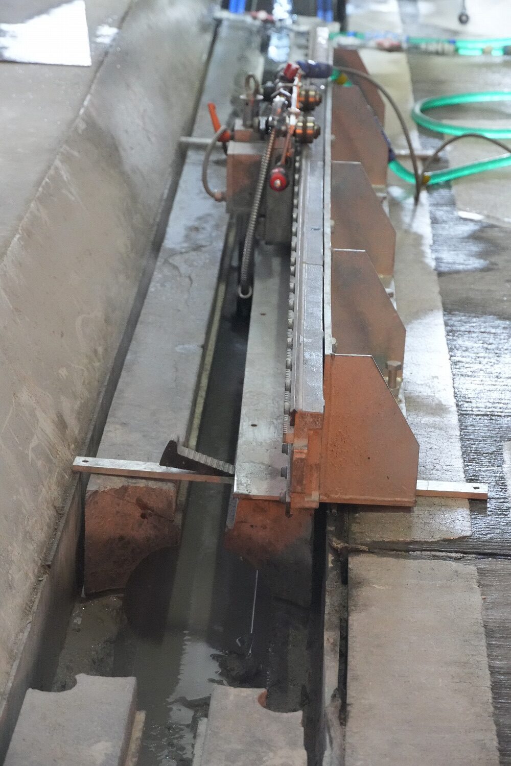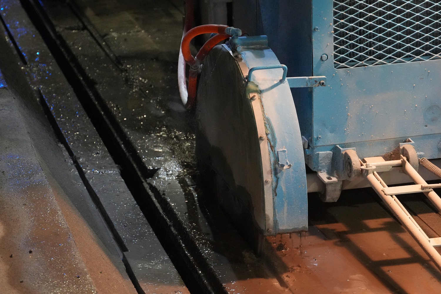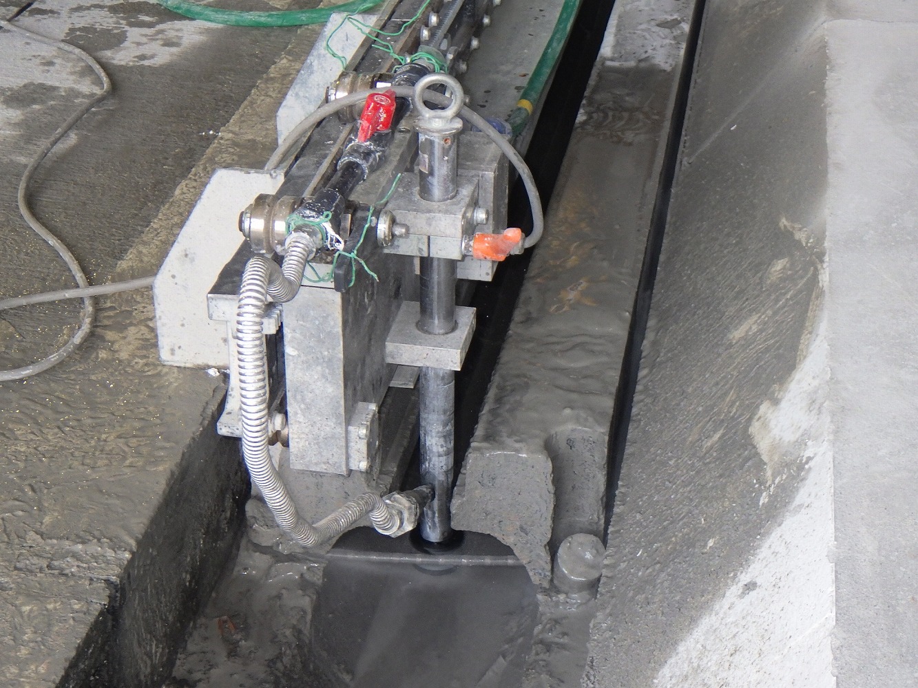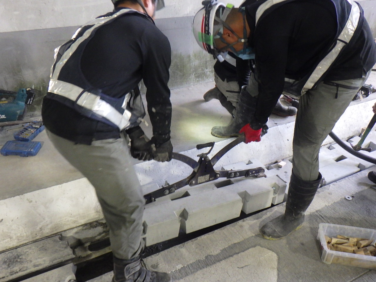 ワイヤーソーの施工は1セット当たり長さ4mの切断が可能で、ロードカッター施工からワイヤーソーでの切断までの作業を1日当たり2~3セット、8~12m施工できるということだ。
