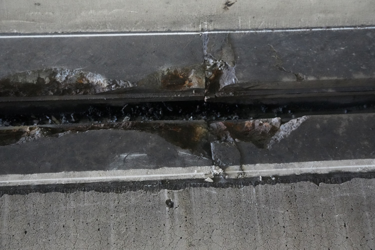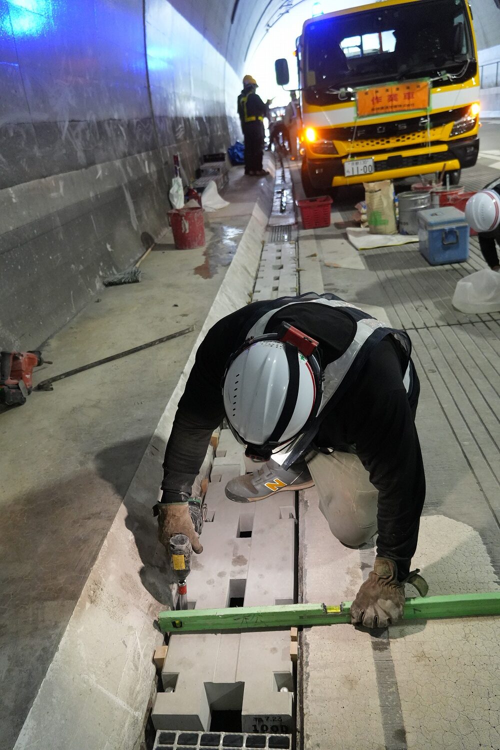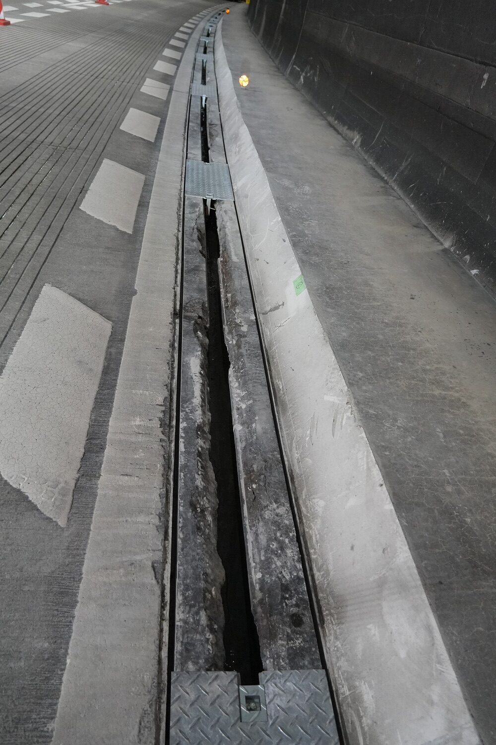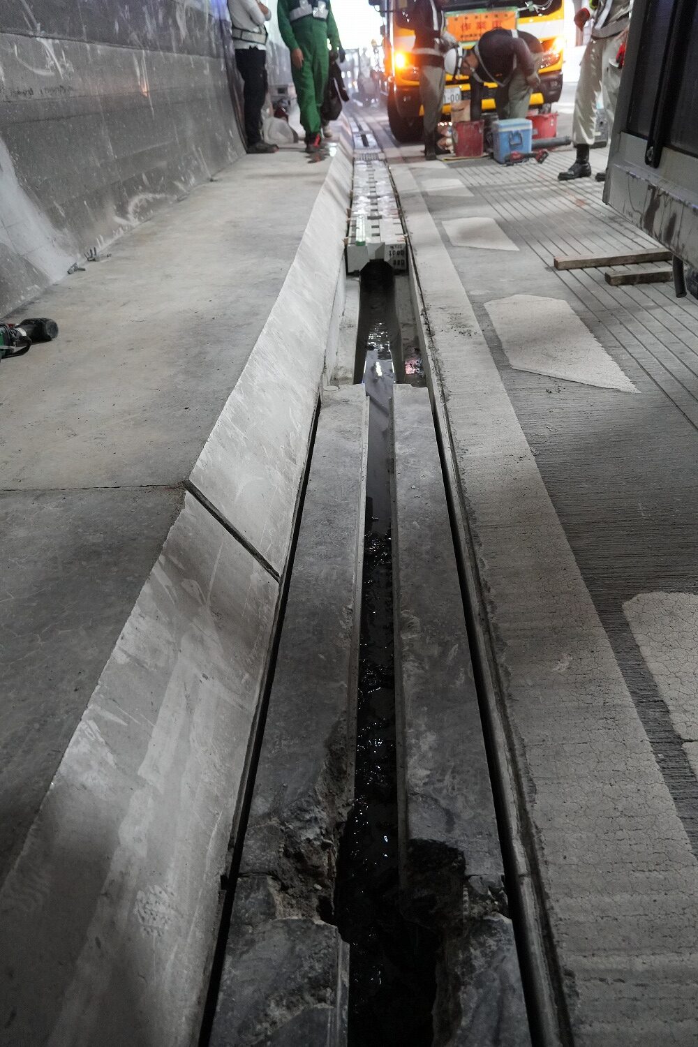 今回取材した金仙寺トンネル(上り線)は1988年に供用された延長260mのトンネルで、過年度に補修された両坑口付近の20m以外の240mの円形水路を約4週間かけて補修した。同トンネルはは2.5%の下り縦断勾配、走行→追越に向かって5.0%横断勾配があり、写真のように追越車線の円形水路上面が著しく損傷している箇所が見られたため、今回のような大規模な補修を行うことにした。本工事の元請はスバル興業。一次下請はナガタ工業(切断、撤去)、二次下請は丸辰道路工業(大阪)(同)。プレキャストRC蓋の製作はソイル工業が行った。