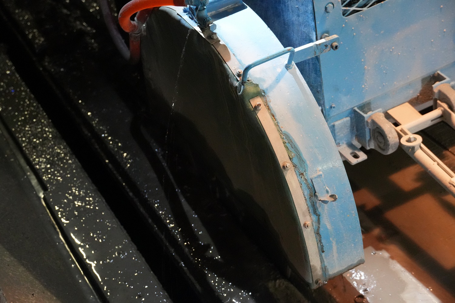 また、ワイヤーソーの機械は、写真のように防弾性の高い透明ポリカーボネートを使用している。透明化したのは「機械の異常検知をし易くすると共に、視察に来た方に機械の構造と性能を分かりやすく説明できるようにするため」(ナガタ工業・福島社長)ということだ。