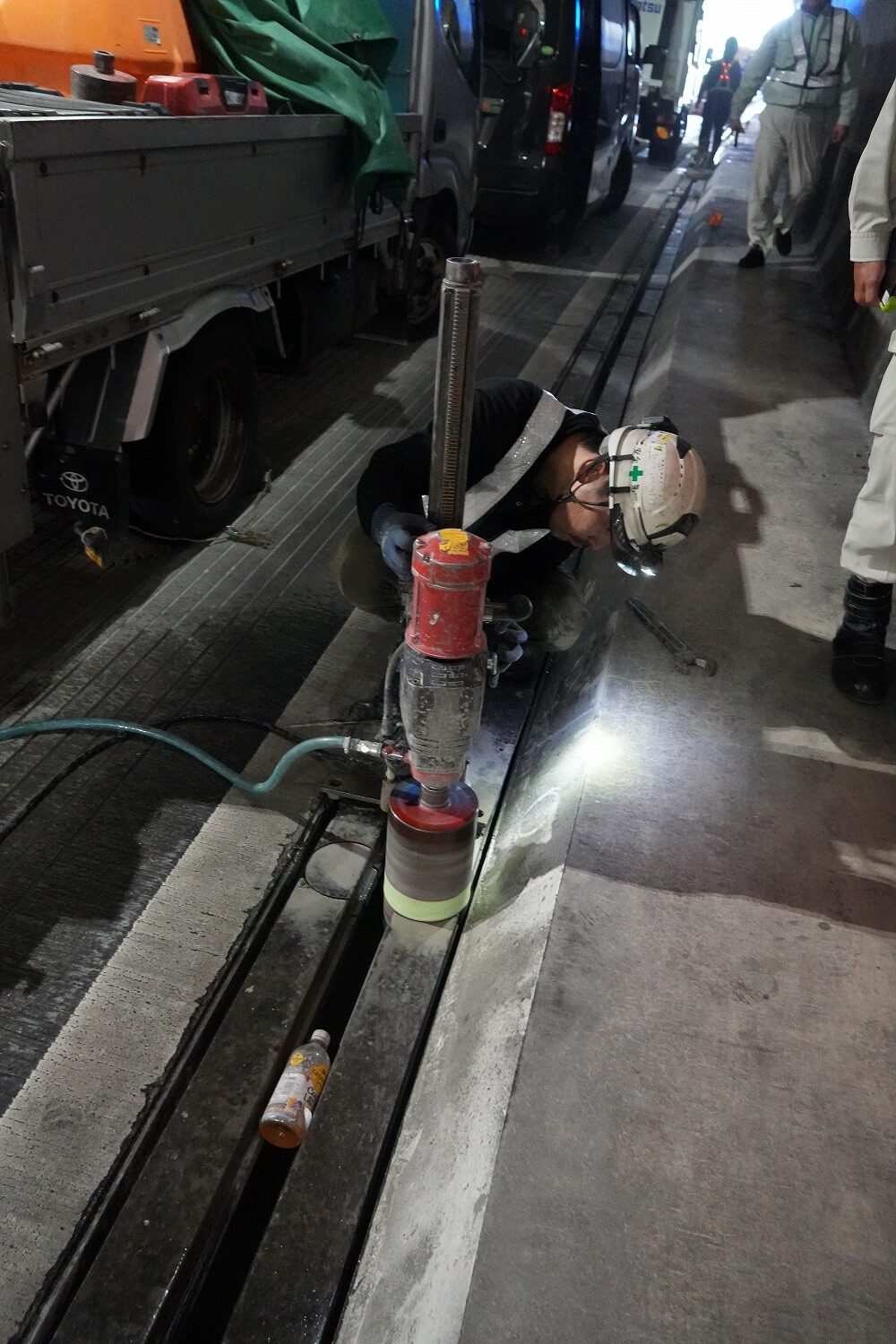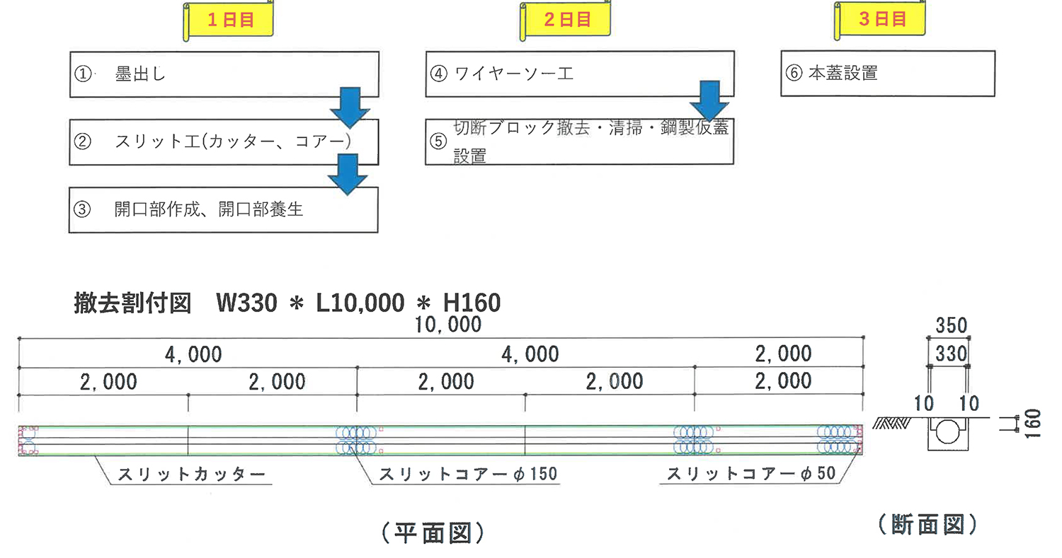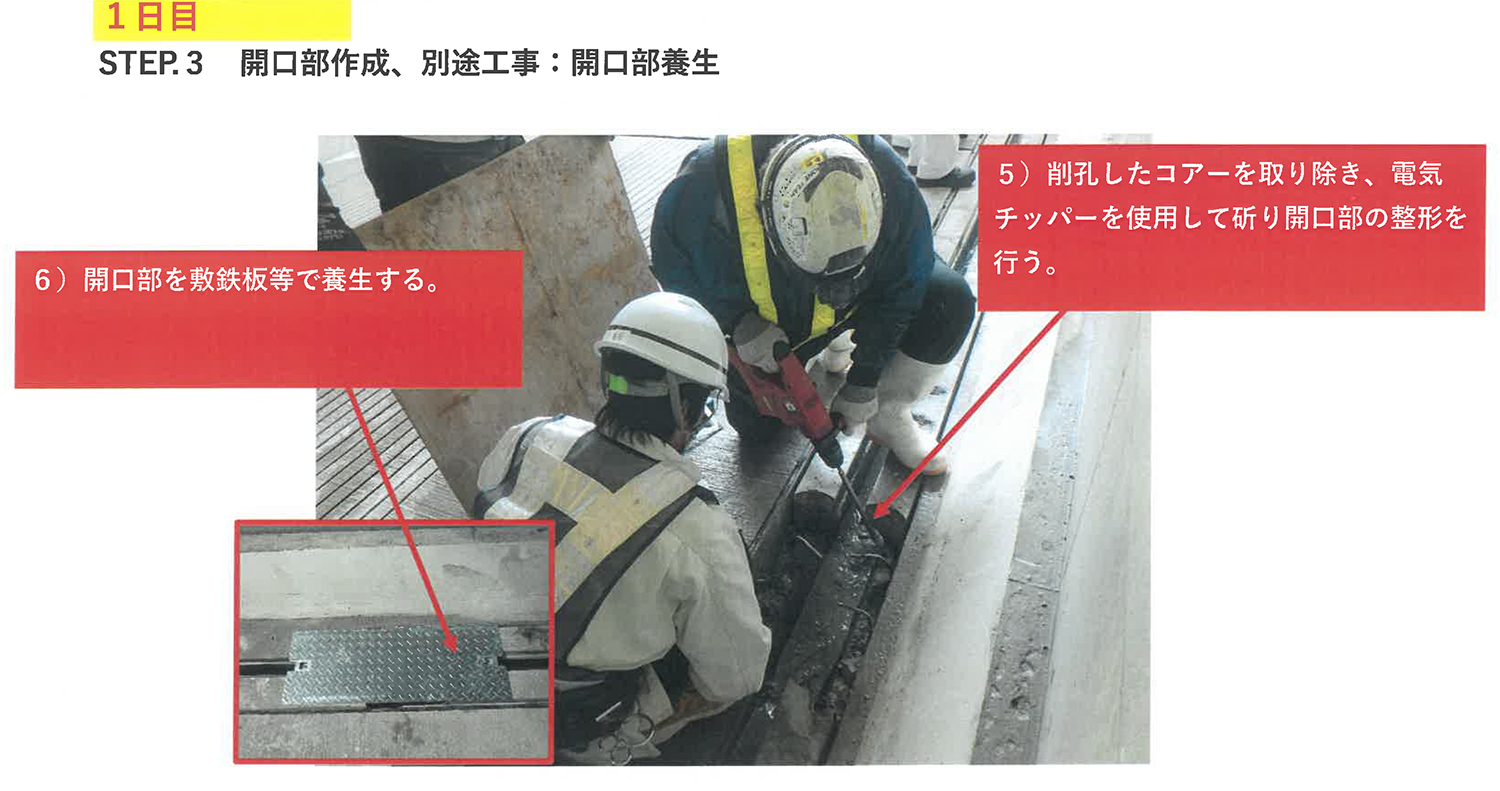 施工は、ロードカッター3人、コア削孔2人、開口部施工2人、ワイヤーソー施工4人、蓋設置4~5人の12~13人が従事した。