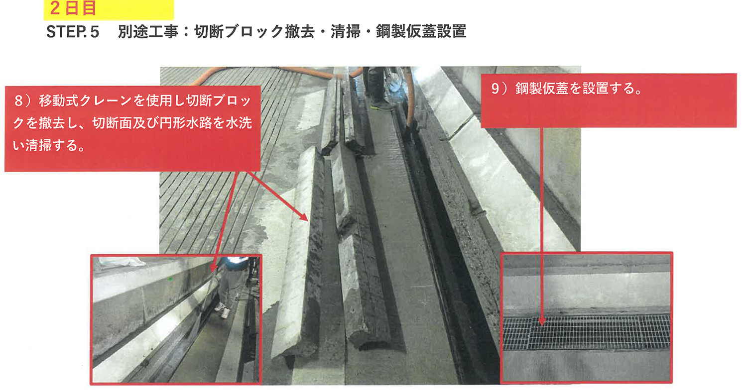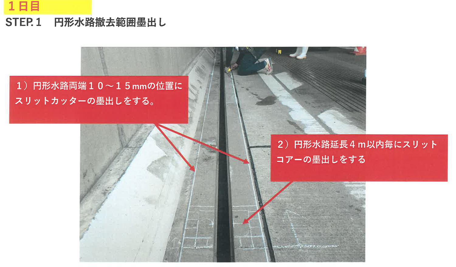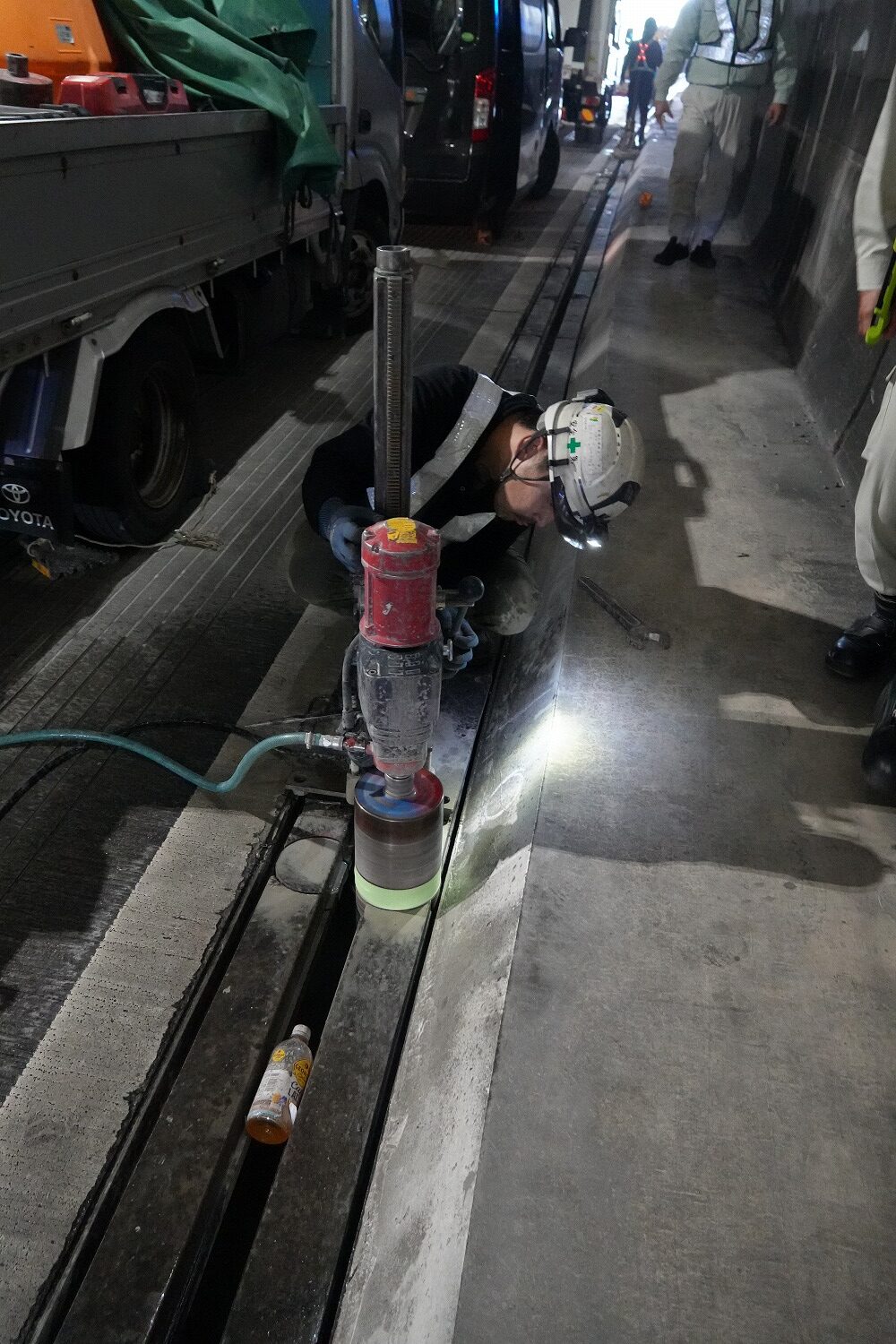 施工は昼間(9時~17時)に1車線を規制して行う。まず、ワイヤーソーのダイヤモンドワイヤーを入れるための溝をつくるため、ロードカッターにより深さ150mmほど円形水路の両側に鉛直の溝を入れる。その際は10~30mmの側壁をあえて残す形で施工する。これは路盤や土砂の崩れを止める土留めとするためである。トンネルの際ぎりぎりまでを施工するため、ロードカッターに用いるダイヤモンドブレードの留め方も工夫しており、従来の大型ナットではなく、頭高の低いボルト6本で止める方法(フラッシュカット)を採用して施工した。次いで、φ160mmのコアカッターでワイヤーソーのプーリーを設置するためのコア削孔とベビーチッパーによる斫りを行い、プーリーを作成した開口部に設置する。