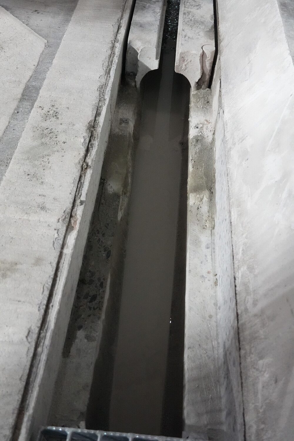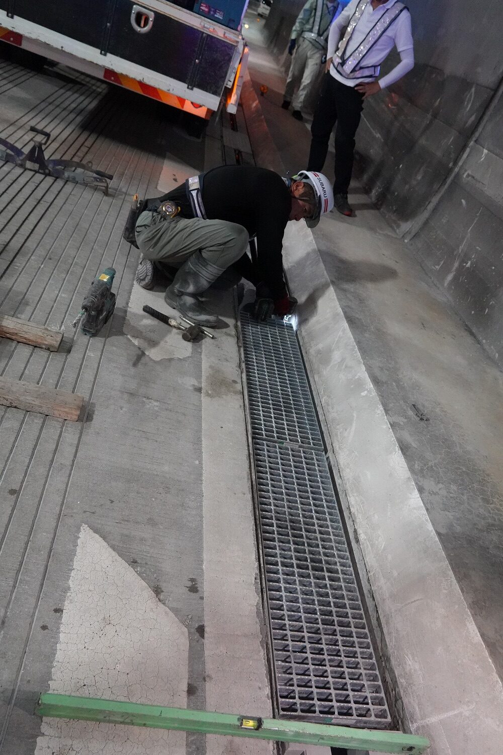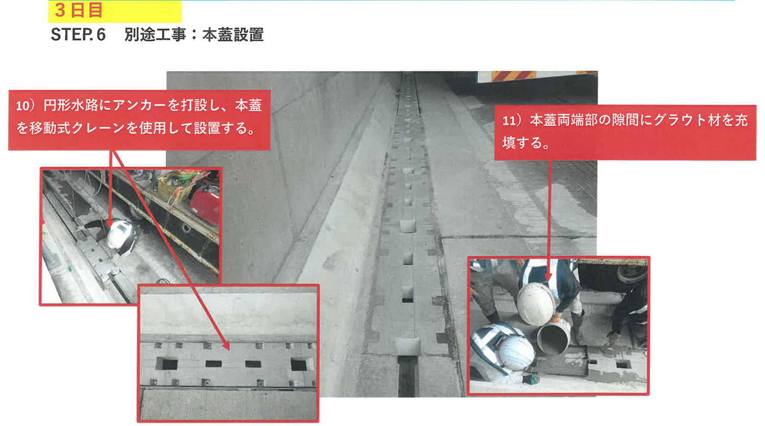 円形水路上面の切断後は、すぐにプレキャストRC製の蓋を設置するのではない。「1日の実施工時間が5時間程度と短く、12mを完成形までもっていくのは難しいため」(岩橋氏)だ。そのため、切断日当日は鋼製グレーチングで仮蓋を設置、翌日にプレキャストRC製の蓋を設置する工程としている。