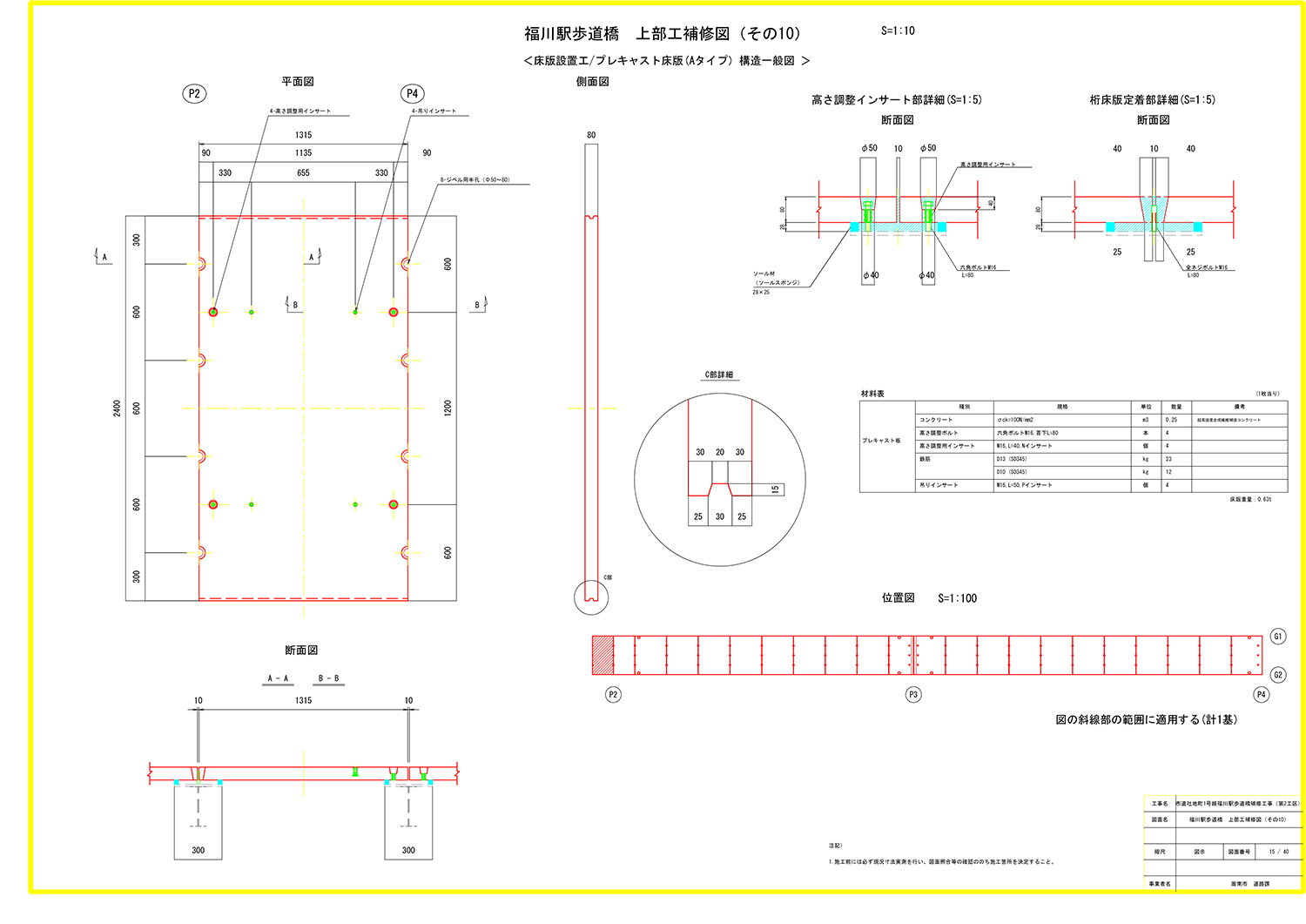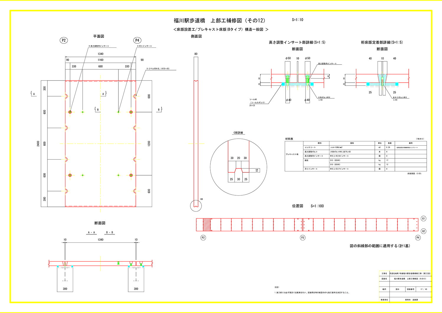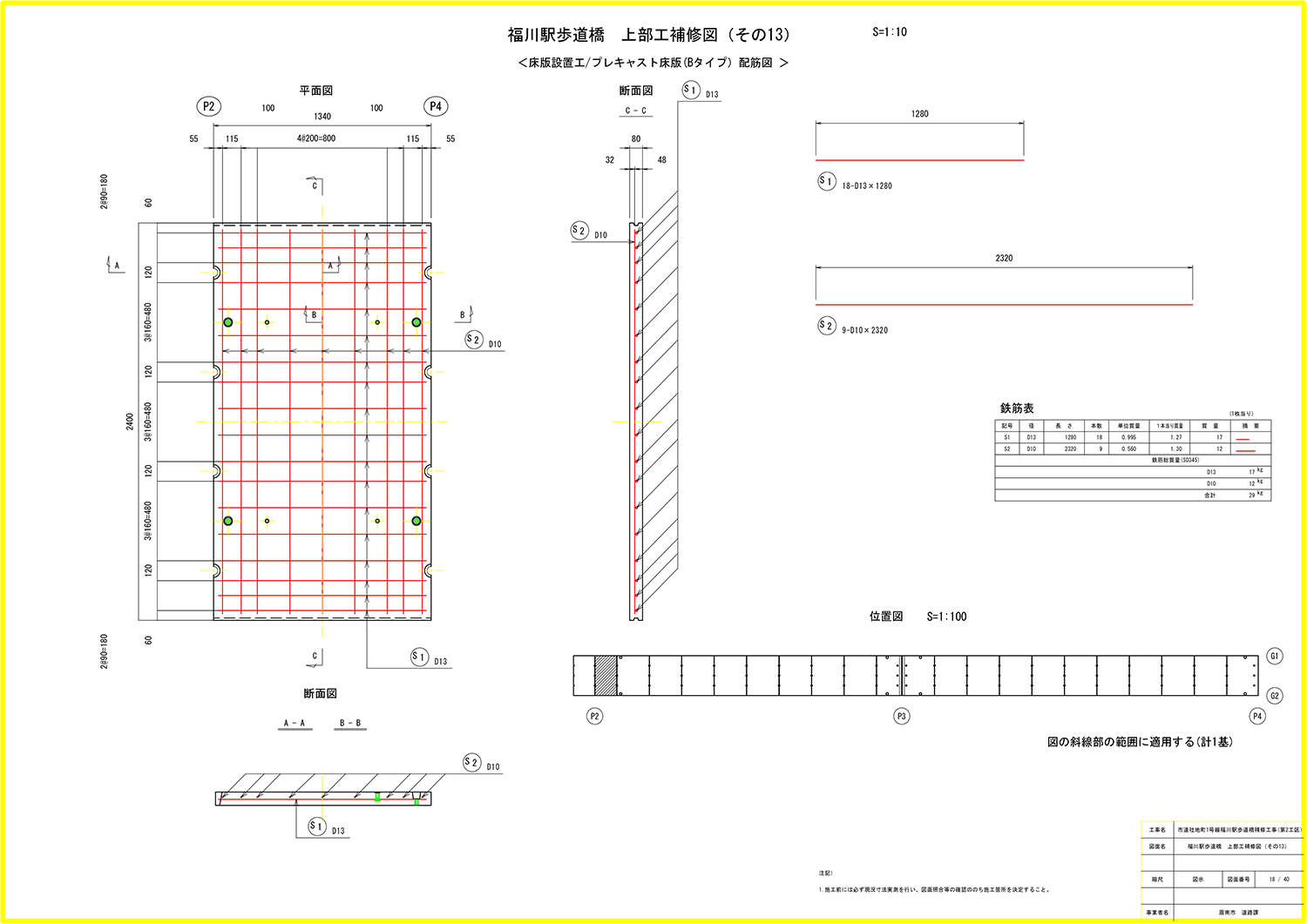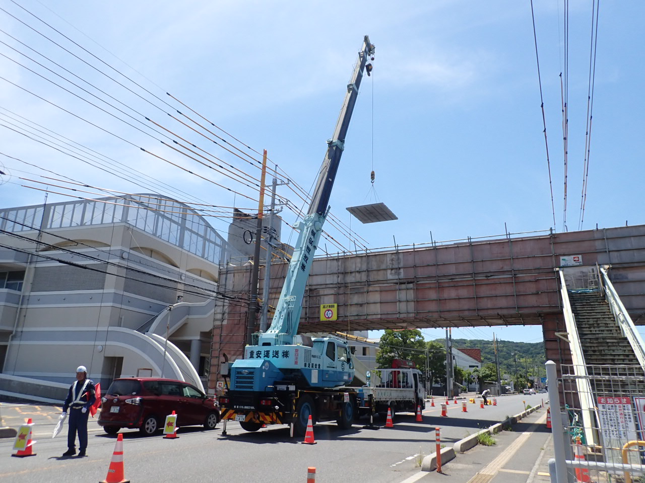 施工は、まず、既設床版を撤去した後、横桁フランジの拡幅を行った。これは、中路式の歩道橋では、横桁にプレキャスト床版を支持させる必要があるが、横桁のフランジ幅が狭く、そのままでは床版が設置できないための処置である。床版の割付は、横桁のピッチに合わせて行い、約1.3~2mにて割り付けた。