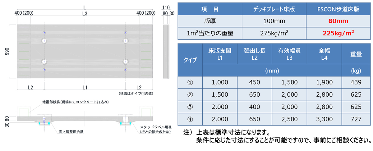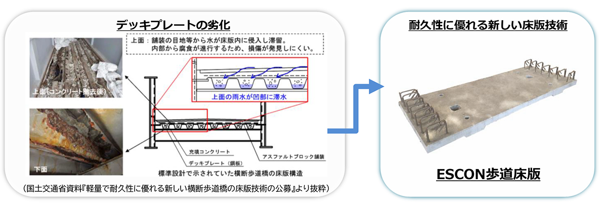 ESCON歩道床版は、高強度繊維補強セメント系複合材料(VFC)の一種である『ESCON』を用いたプレキャストRC床版である。ESCONは圧縮強度100N/mm2以上の超高強度材料であることから部材の薄型化が可能であり、それに伴って既設床版と同等以下の重量にできるため、桁や下部工への負担を増やすことなく床版更新が可能な工法である。さらにコンクリートは緻密な組織を構成するため、水や塩化物イオンといった有害因子の侵入がほとんどなく、海岸地域や融雪剤散布地域などの高腐食環境下においても優れた耐久性を発揮し、維持管理コストの低減が可能となる工法である。
