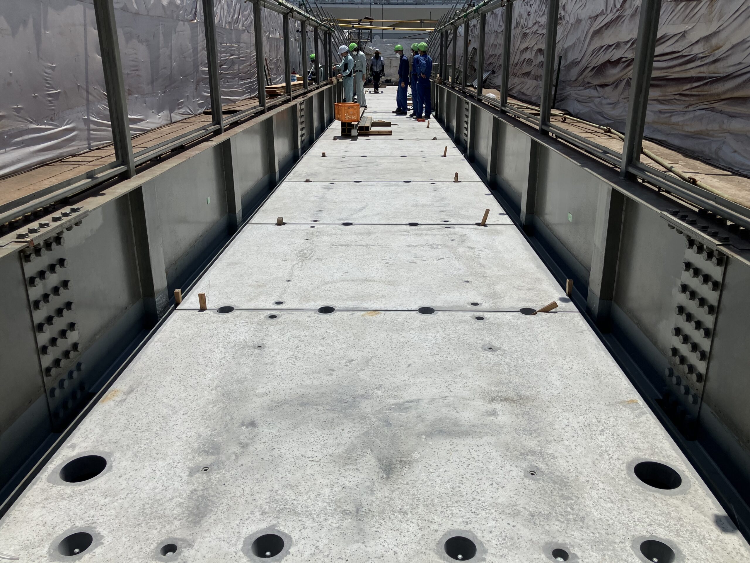 同床版は、スタッドジベルとの接続部が半円状になっており、隣接する床版が合わさって円状になることによって、スタッドジベルを躱す形で架設、その形成された孔から無収縮モルタルを打設することにより、横桁と床版の一体化をはかっている。