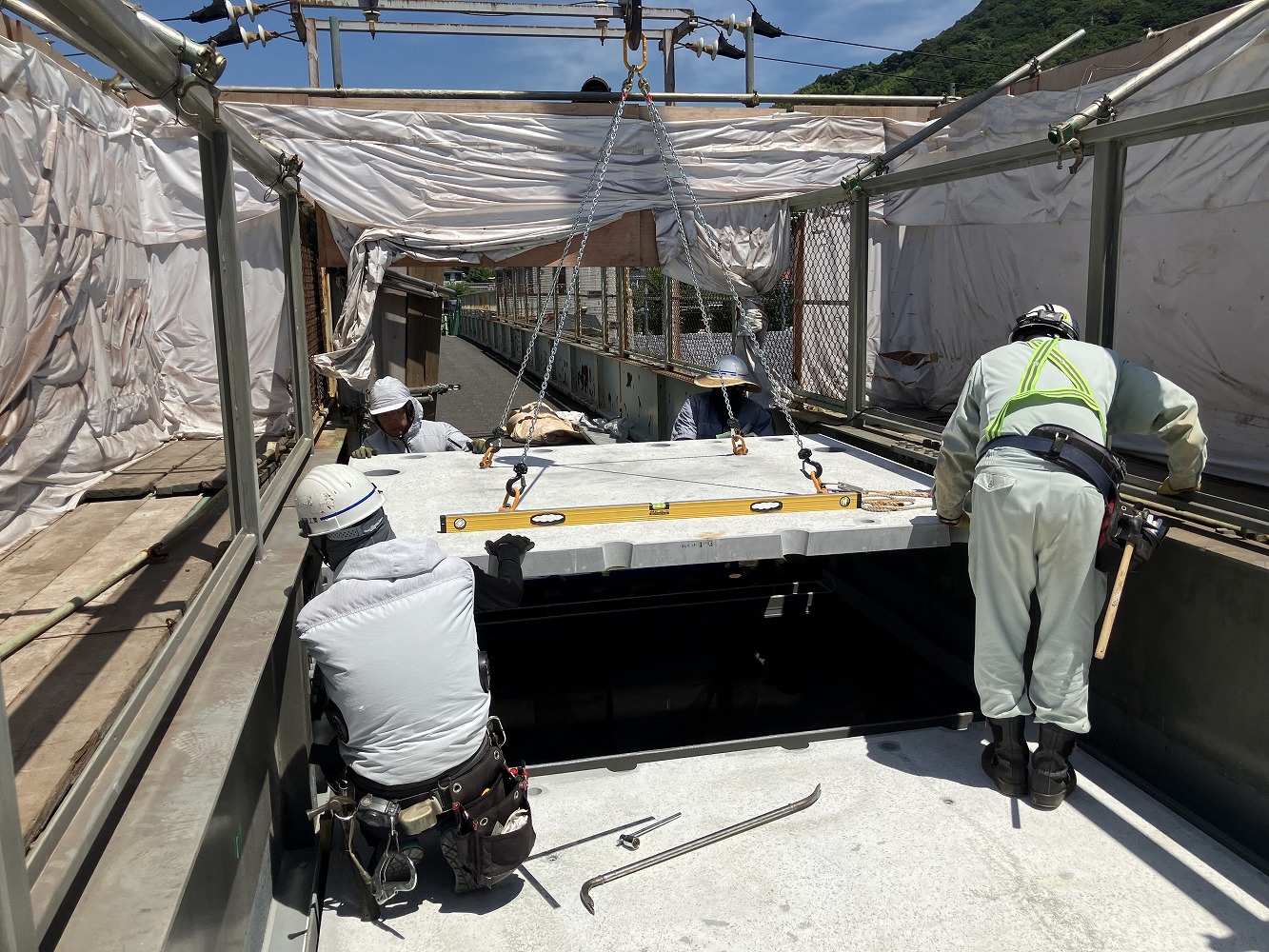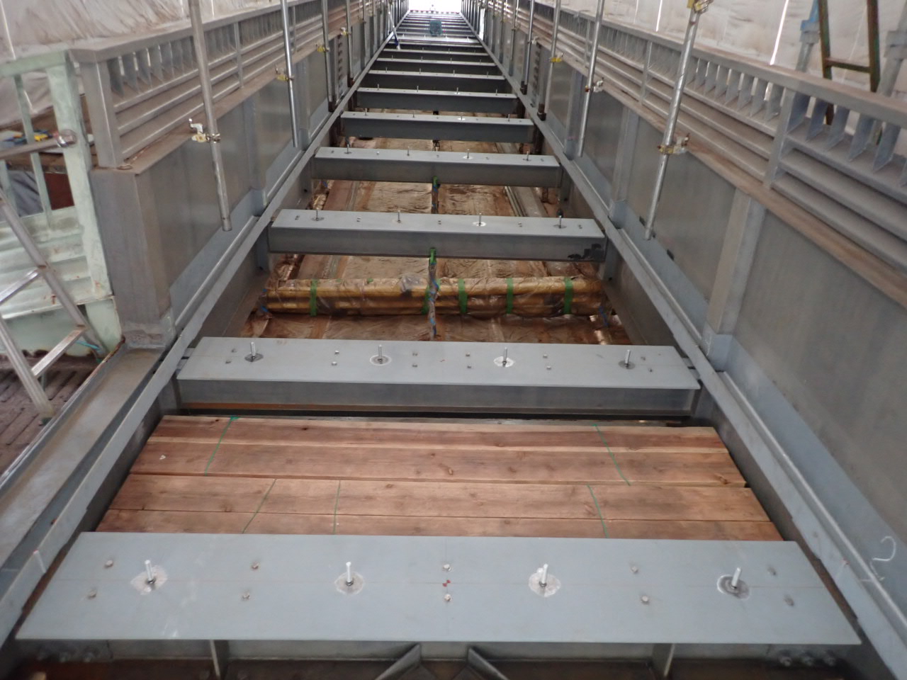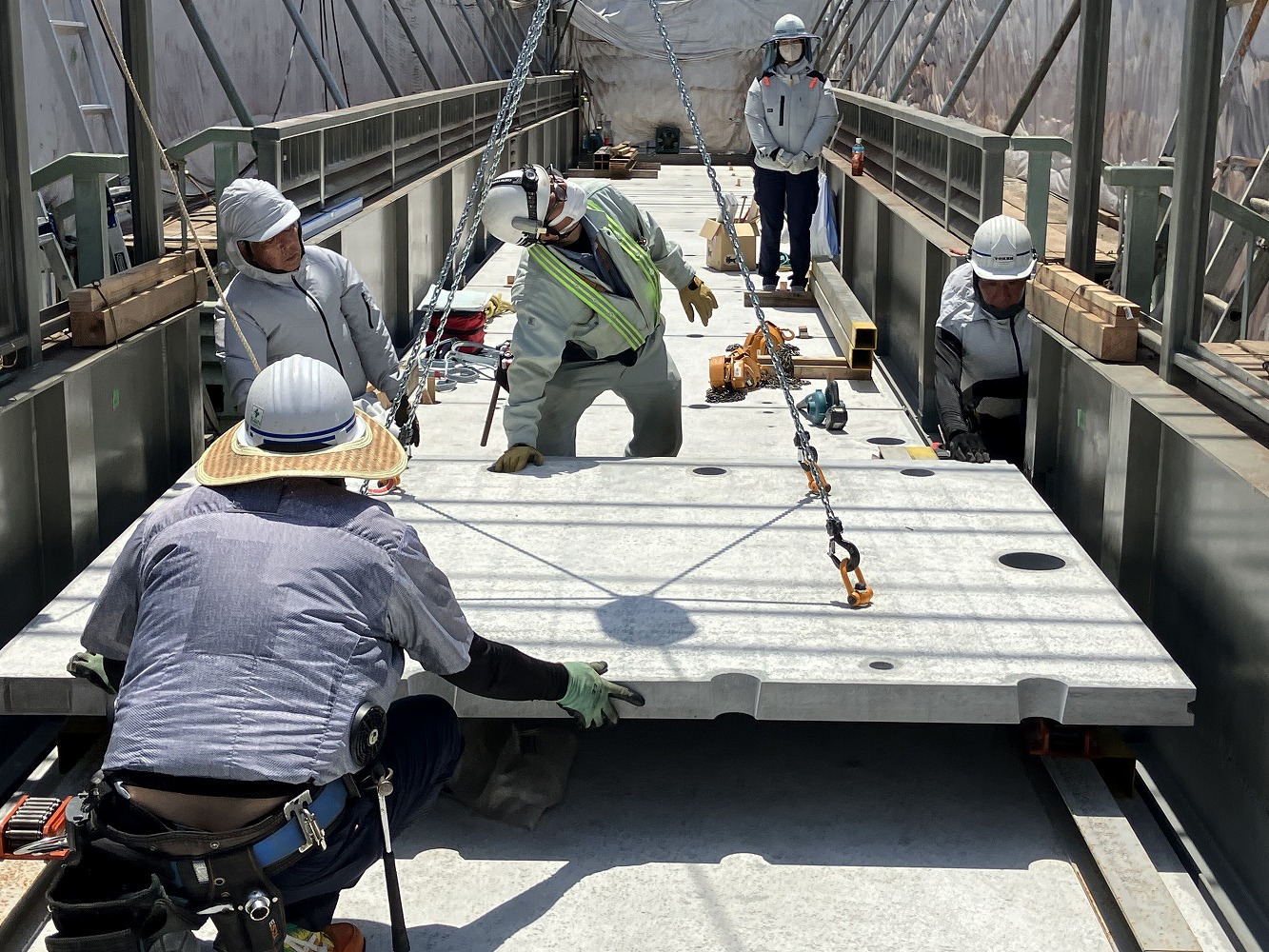 一部の床版はローラーとチェーンブロックを用いて人力により移動・架設