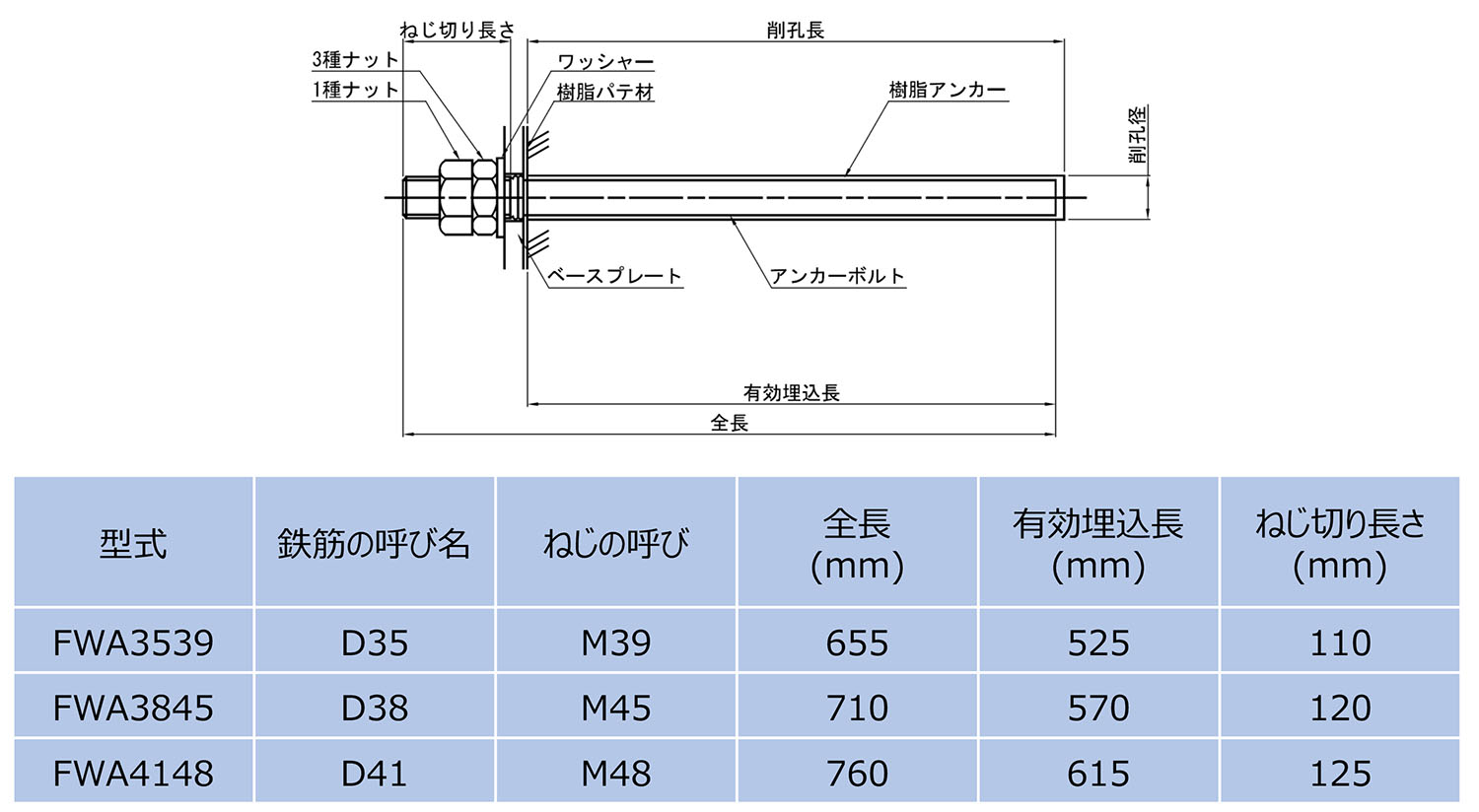 橋梁の補強補修、落橋防止工で使用する金物を固定するあと施工アンカーは、既設コンクリート構造物への削孔時に鉄筋の切断を避ける必要があるが、既設鉄筋の配置位置、間隔が狭く、設計上必要な削孔を実施できないなど、アンカーの位置設定、サイズ選定を検討する必要がある。従来の工法では、あと施工アンカーとして使用する鉄筋にねじ加工を直接施した材料を使用しているが、有効断面積を低減する必要があり、よりサイズの大きい鉄筋、削孔径を使用する必要があった。