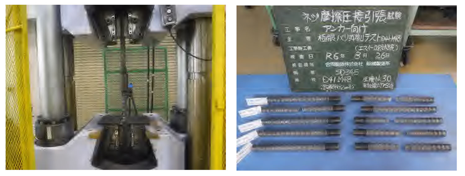 両社は、直接、ねじ加工を施す方法ではなく、摩擦圧接の技術を活用し、鉄筋本来の有効断面積を確保し、削孔の小径化を検討し、鉄筋の有効断面積より大きい有効断面積を持つねじを、鉄筋端部に摩擦圧接により接合し、あと施工アンカー材とすることに成功したものだ。摩擦圧接は品質管理の行き届いた工場で実施され、引張試験により鉄筋(SD345)の降伏点又は耐力(345N/mm2)、および引張強度(490N/mm2)以上の機械的性質であることを確認している。