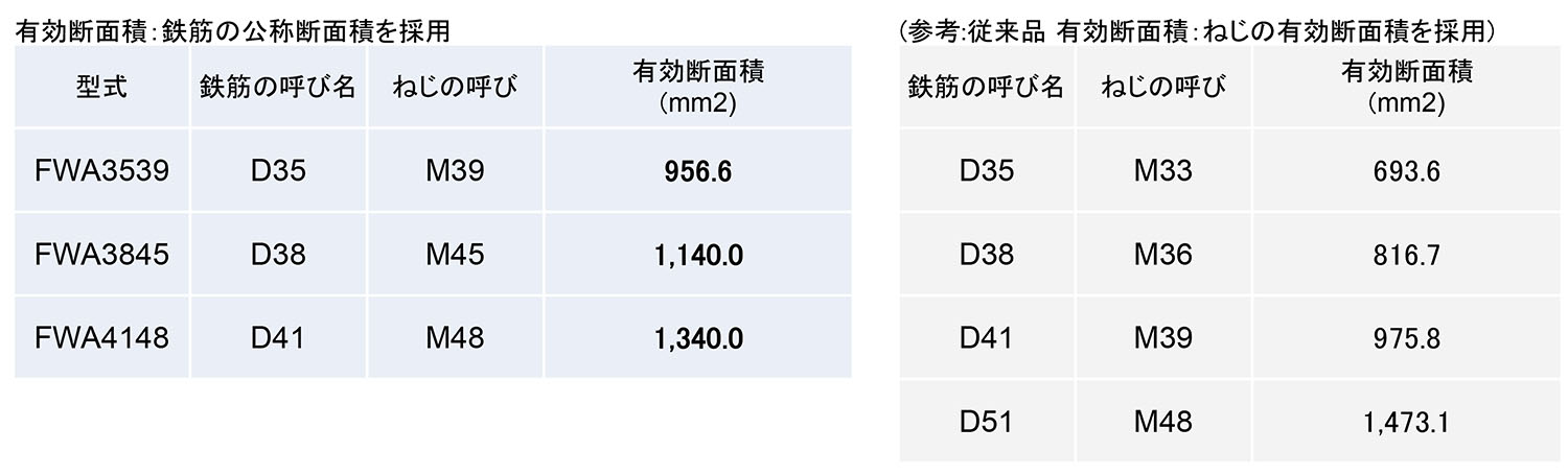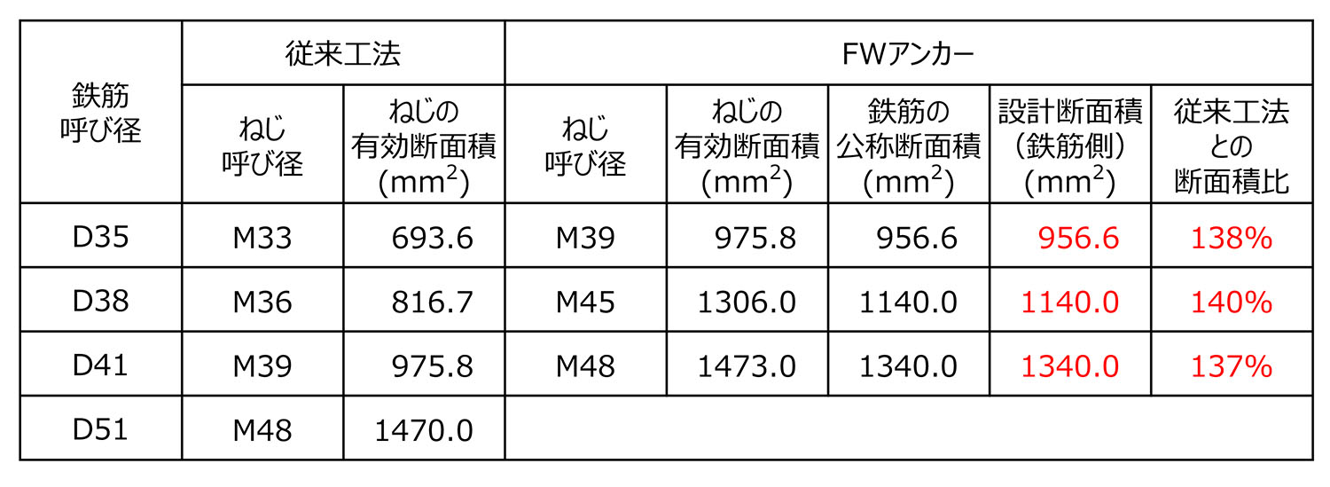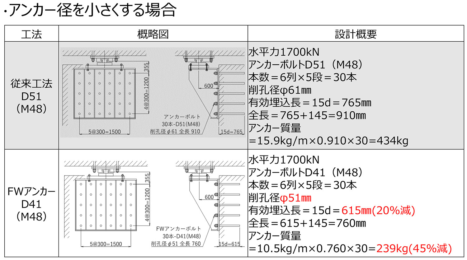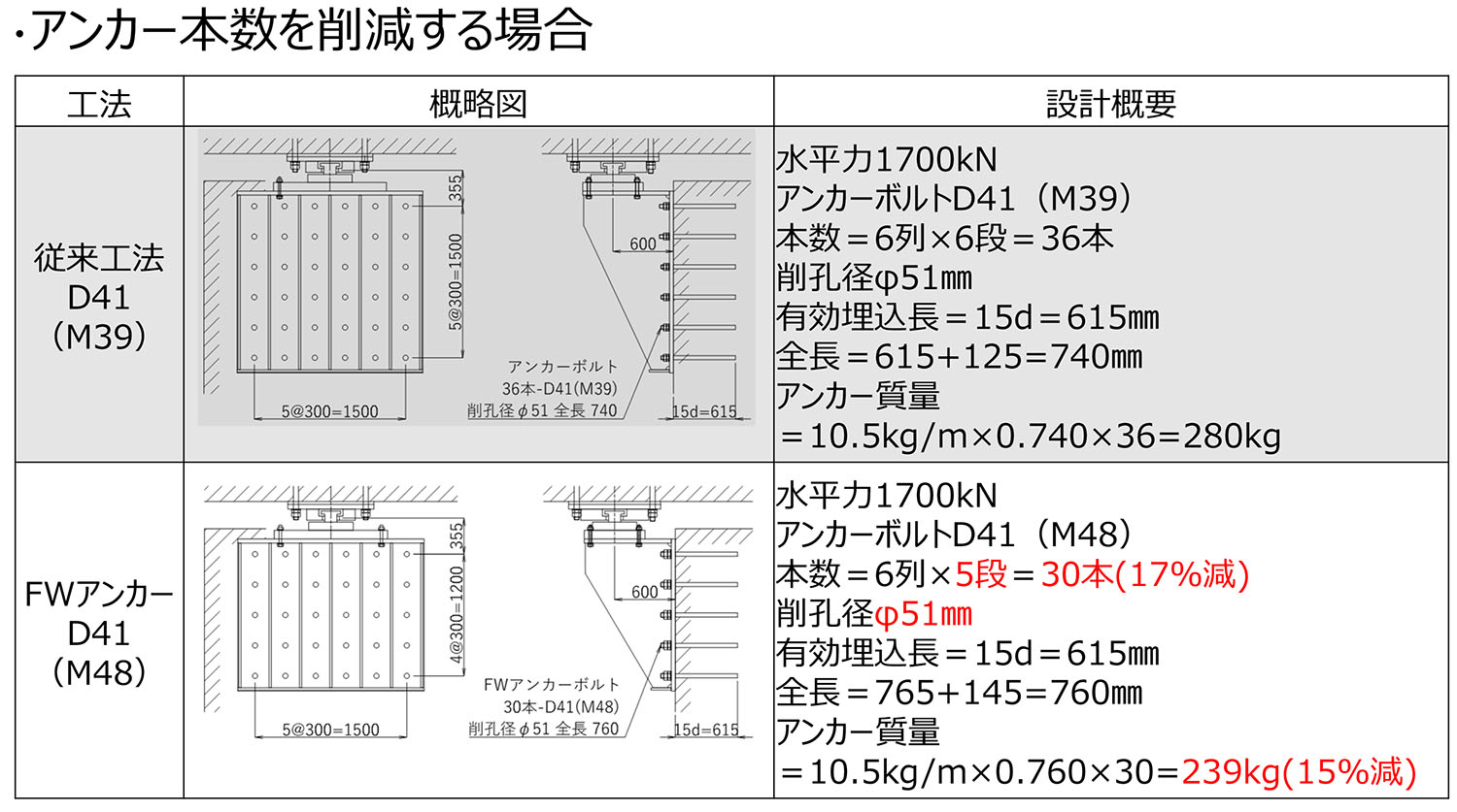 有効断面積は従来工法と比べ、3~4割も向上しており、その分、アンカー径や有効埋め込み長を短くすること、あるいはアンカー本数を少なくすることができる。耐震補強のブラケットなどを設置する場合、いつも施工者が悩むのは既設鉄筋との干渉であるが、径や埋め込み長、あるいは本数を削減できることは、単純な材工コストの縮減だけでなく、干渉による削孔のやり直しや埋め戻しモルタル量の減少にもつながるため、見えないコスト縮減にも役立つアンカー工法といえそうだ。