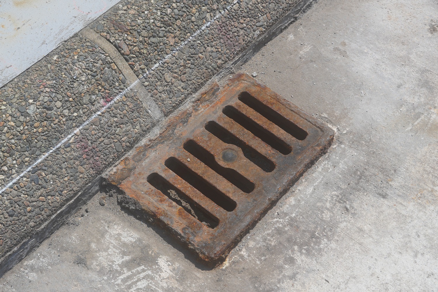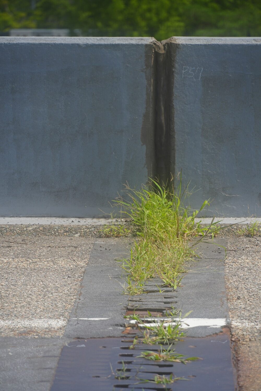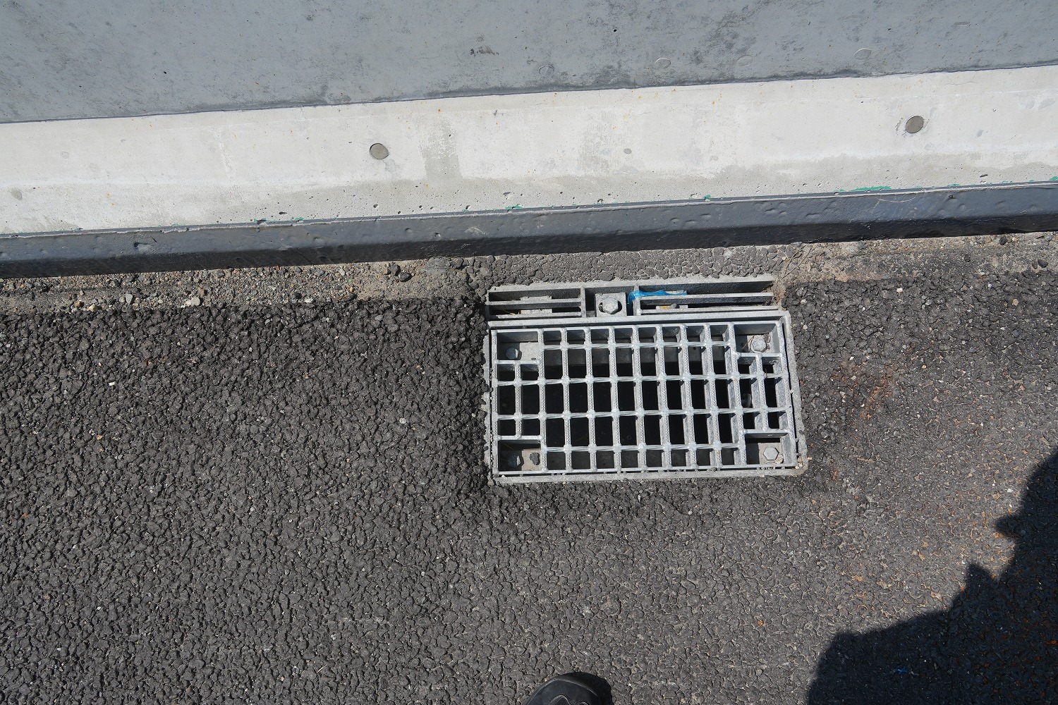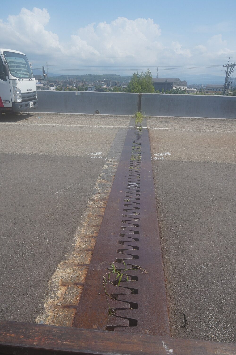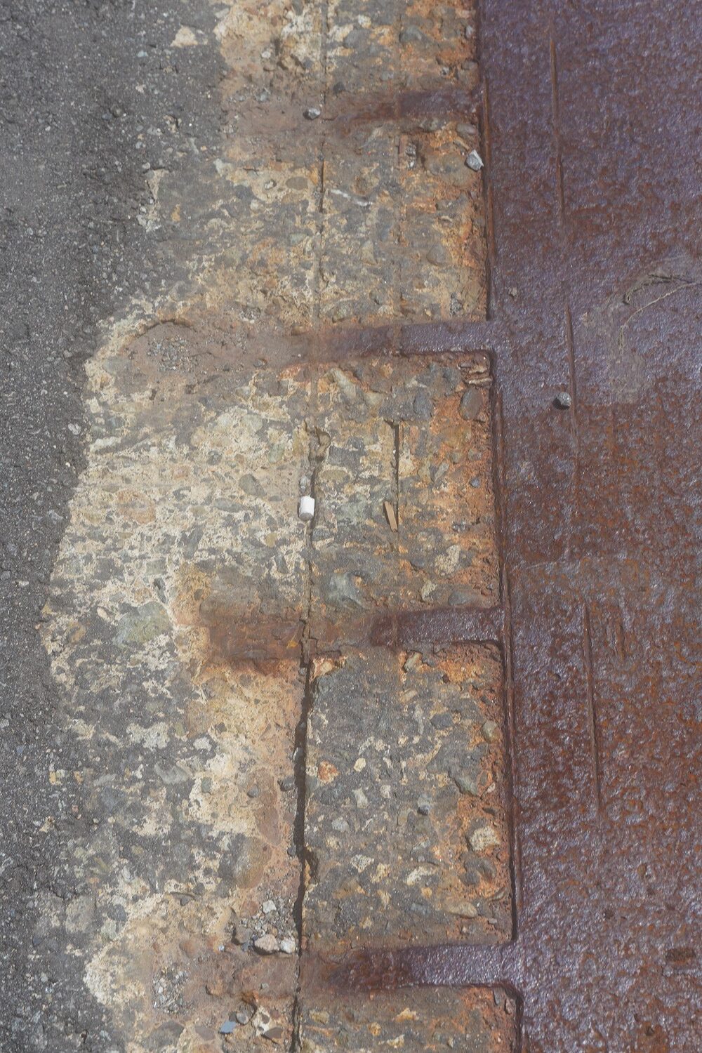 床版取替未施工部、舗装や排水桝、ジョイントにも劣化が見られる(井手迫瑞樹撮影)