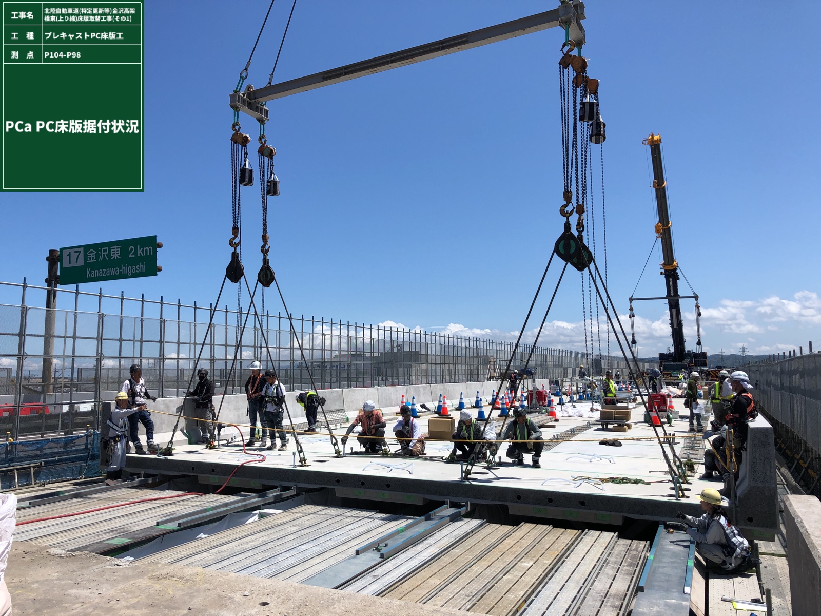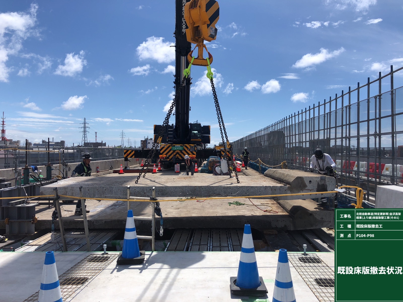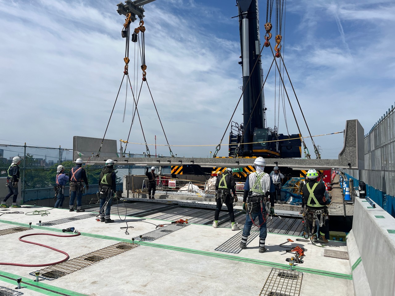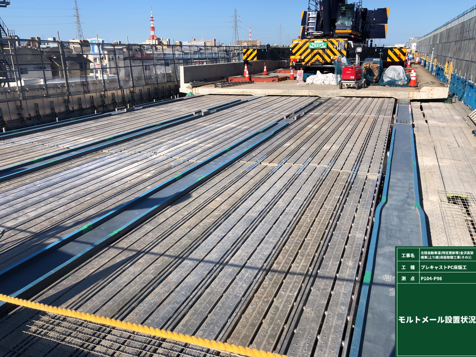 撤去後は鋼桁上フランジ上面を人力でケレンし、残コンの除去、下地の研掃を行い、ジンクリッチペイント塗布後にシールスポンジを設置した。次いで翌朝、床版パネルを架けていった。床版パネルは1部材当たり2.4m×11.5mの壁高欄一体型を用いており、重量は最大で22tに達した。これを1日当たり片方で5枚(新設パネル換算)、合計10枚の施工を繰り返した。