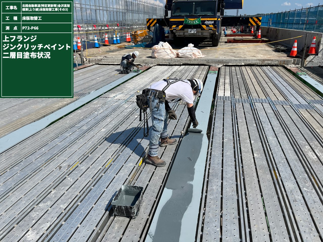 既設床版撤去後のフランジ上面の研掃状況 / ジンクリッチペイントの塗布状況