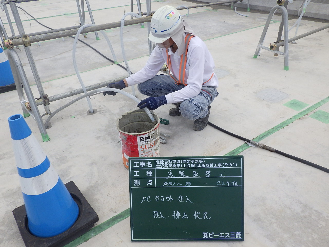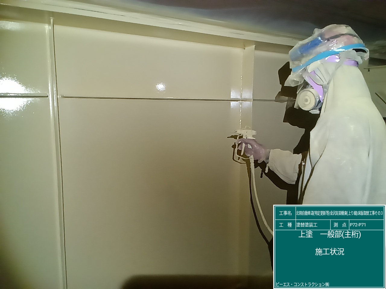 さて、今次工事は、北陸道金沢高架橋の上り線P72~P60およびP45~P39が工事範囲であるが、現在行っている工事は5月GW明けから8月お盆前の69日間、下り線を対面通行規制して、床版取替そのほかの工種を施工した。