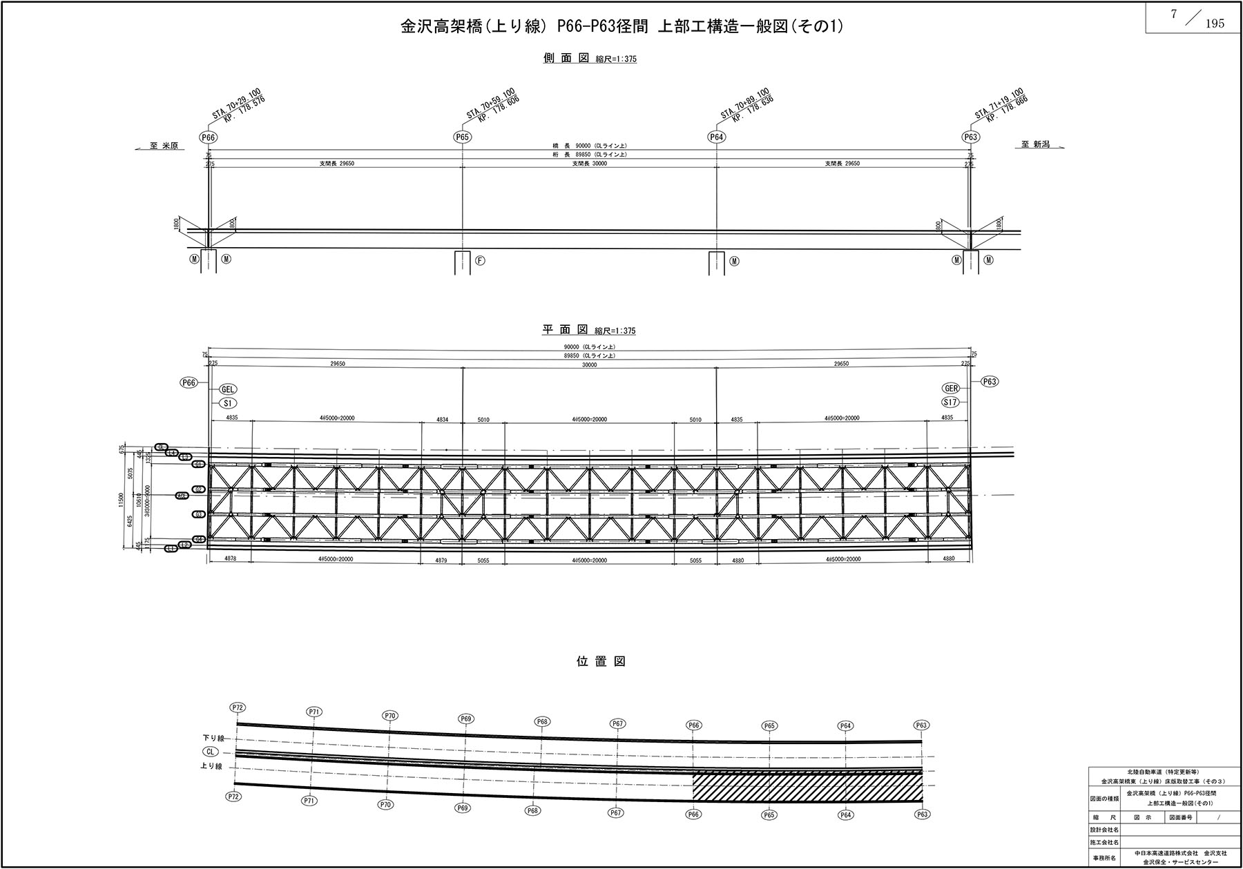 金沢高架橋は、1978年8月に、昭和47年道路橋示方書に基づいて架けられた橋梁である。中空床版橋および鋼2~4径間連続4主鈑桁橋が延々と続く橋梁である。1連ごとの橋長は約90m、主桁間隔は3mで、幅員は11.5mである。今次工事はP72~P60およびP45~P39の6連であるので橋長は約540mとなる。既に6連のうち2連が完了している状況で現在は冒頭に示した通りP66~P60の2連の床版取替を行っている。