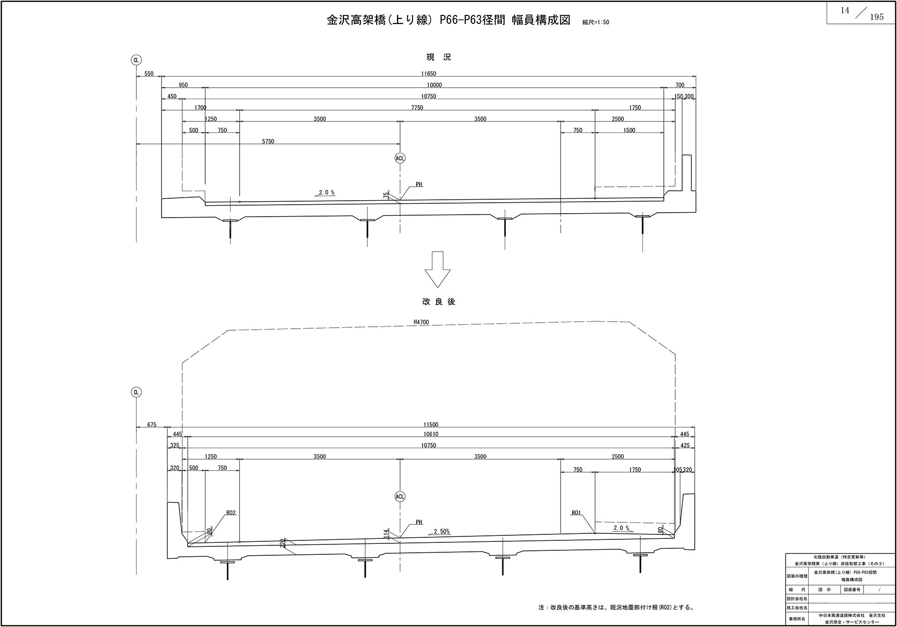 金沢高架橋の橋梁概要図と今回の床版取替位置図