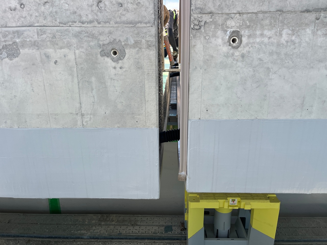 さて、本現場の床版同士の接合は鉄筋継ぎ手構造ではなくPCの縦締め緊張による一体化を採用している。床版架設後はだいたい50~70mごとにPC鋼材の縦締めおよび緊張を行っていく。鋼材はφ21.8mmのスープロストランドを1断面11本用いた。緊張後は2連(6径間)ごとにグラウトを充填する。架設時の床版のPCシース部の接続をスムーズに行うため、ジョイントシースは、施工時に変形追従性を有する東拓工業製のジョイントシースを採用している。継目部は28mmと最小限に抑えており、同部分には床版部は目地グラウト材、壁高欄部には埋め殺しのシールスポンジを配置したうえで、無収縮に近い、ポリマー系のモルタルを用いて、打設していた。