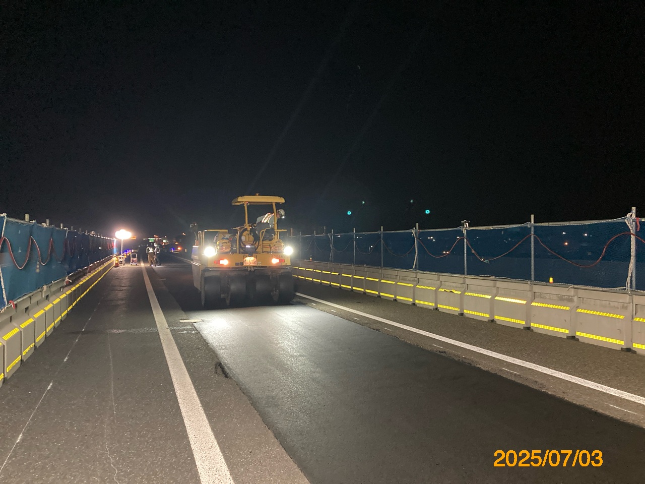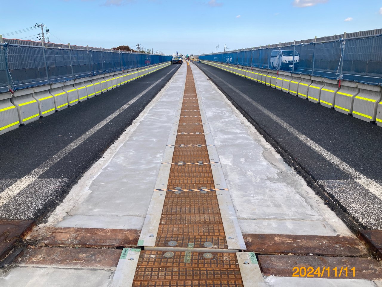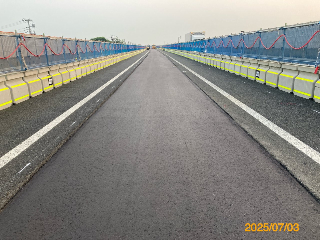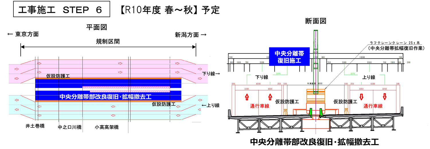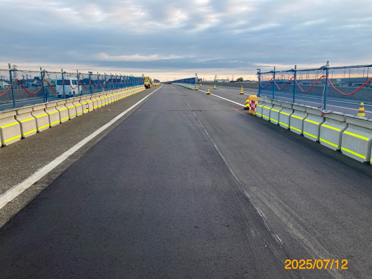 まず、本線(上下線2車線)を路肩側に車線シフトし、中央分離帯側に仮設防護柵を設置、上下線中央分離帯部のガードレール撤去と、地覆部の 平滑化、そして上下線の舗装の一体化である。