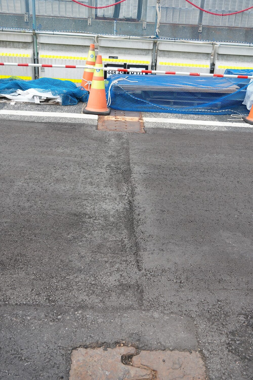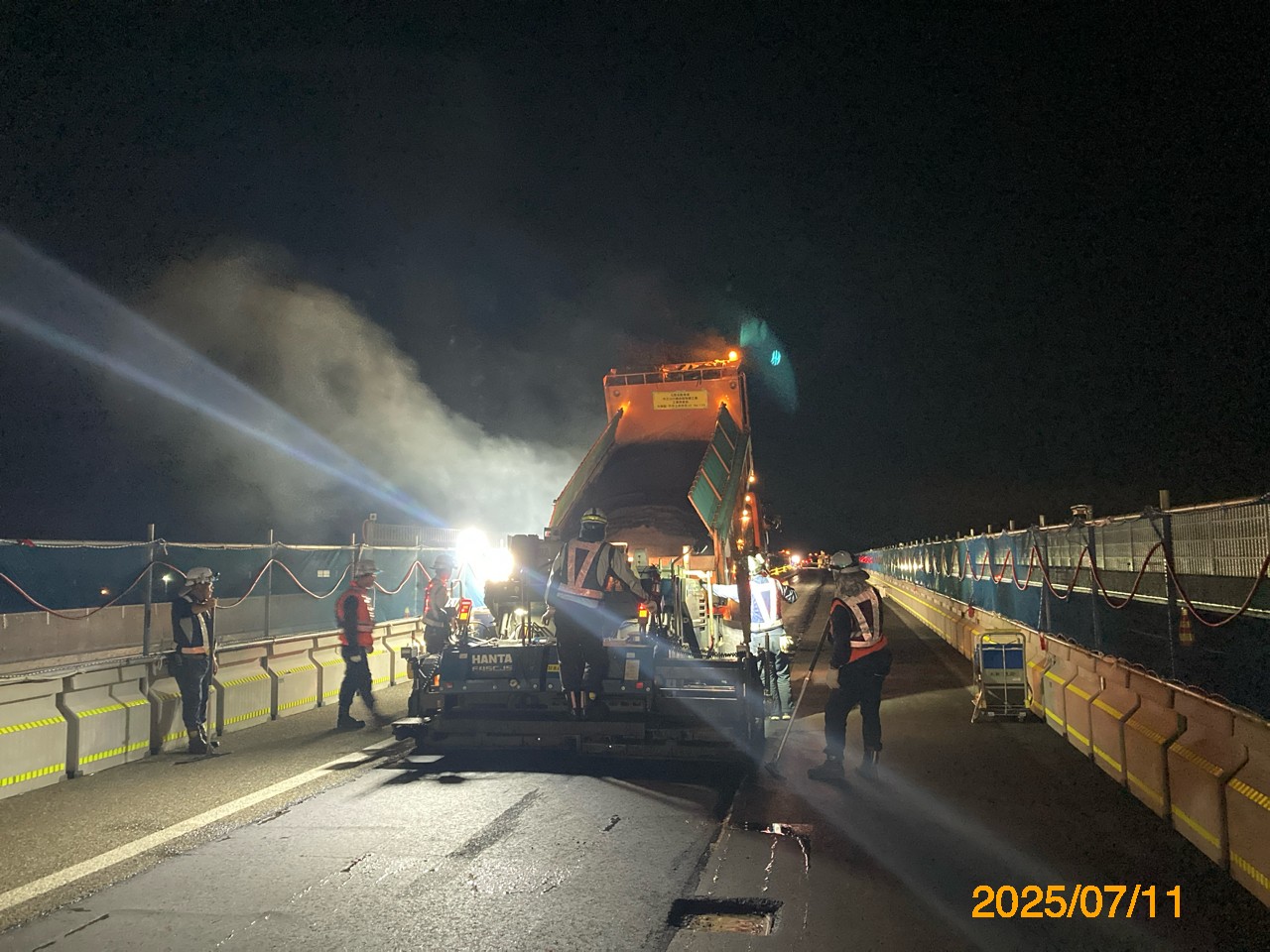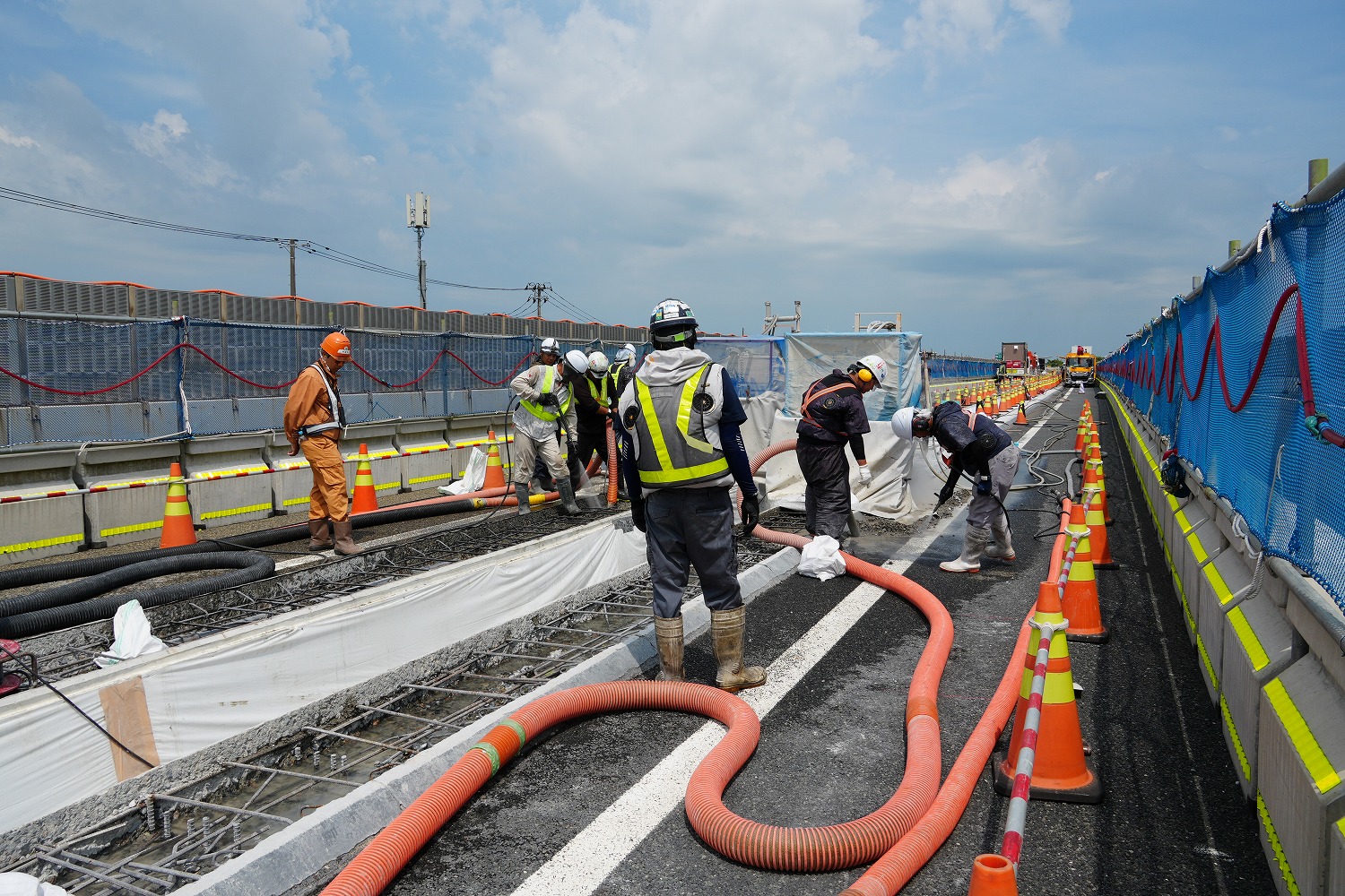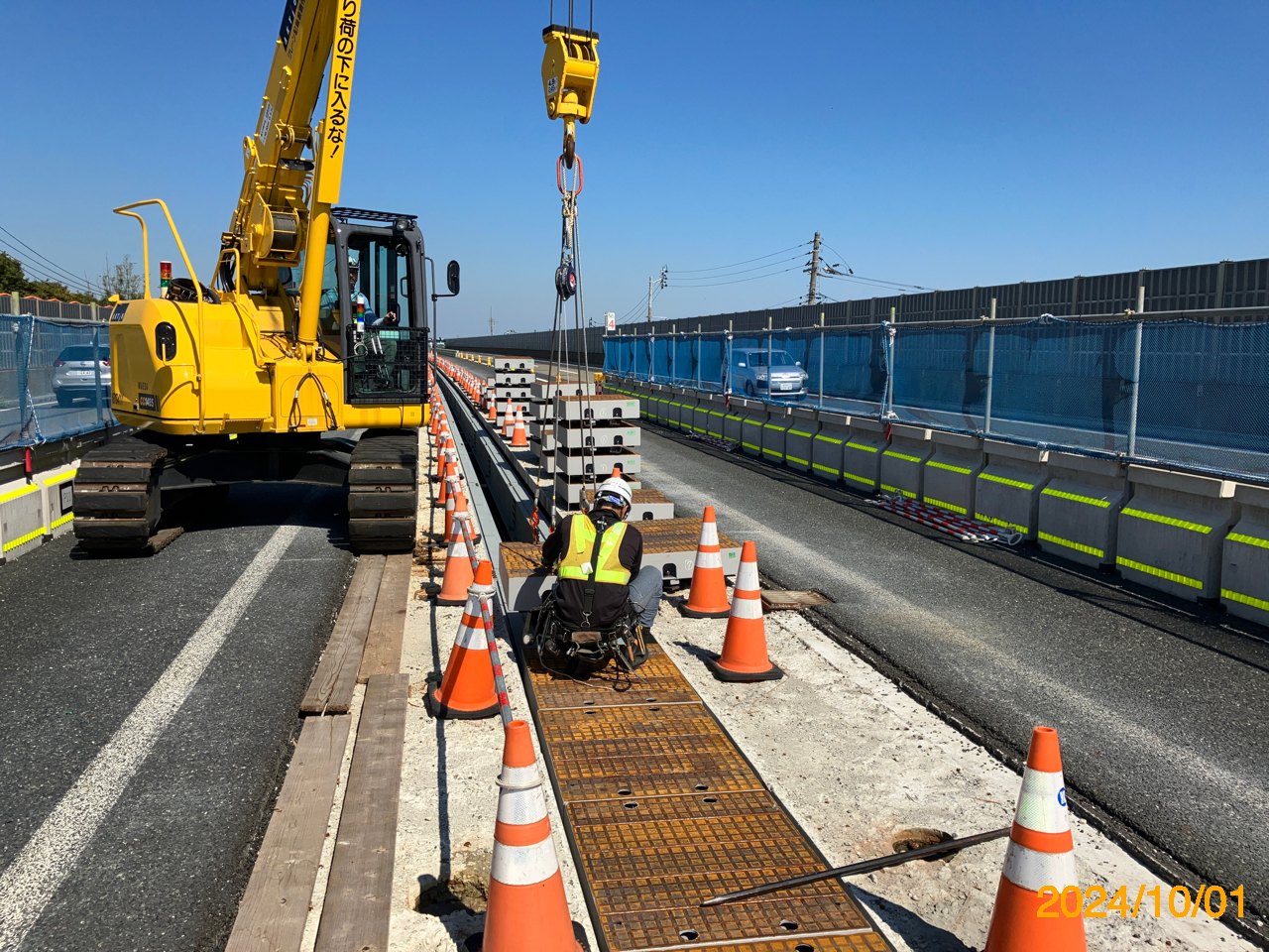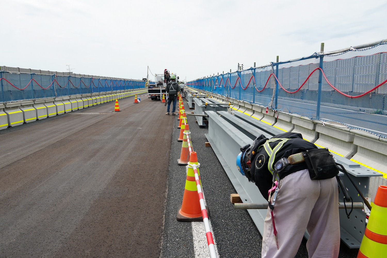 まず、本線(上下線2車線)を路肩側に車線シフトし、中央分離帯側に仮設防護柵を設置、上下線中央分離帯部のガードレール撤去と、地覆部の 平滑化、そして上下線の舗装の一体化である。