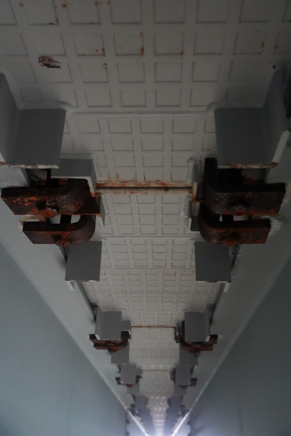 小高高架橋のカルバートボックス部は、鋼桁部と異なりボックス壁面間の離隔が1mほどしかない。そのため横桁は使わず、高さ1,100mm、幅450mmの鋼製ブラケットを6本のアンカーボルトで止めた土台をつくり、その上は橋梁部と同様に、縦桁、覆工版、プレートを配置する。