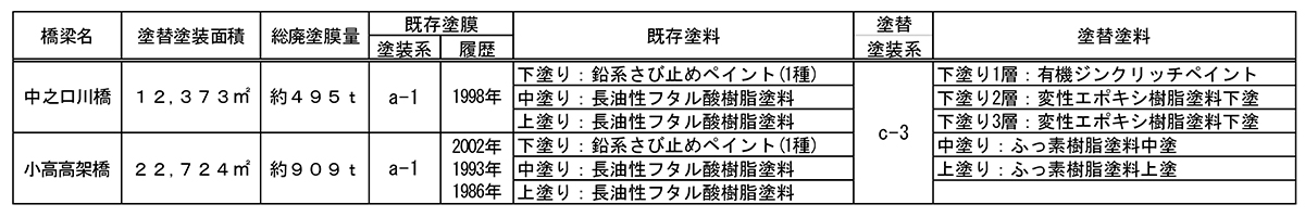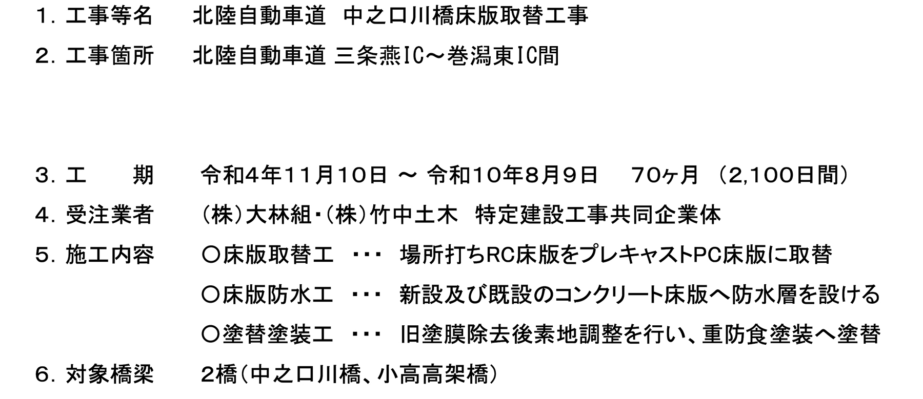 中之口川橋は、1978年9月21日に供用された橋長208.95m、全幅員11.65mの鋼3径間連続4主非合成版桁@2連の橋梁(上下線とも同じ)である。支間長はいずれも34.525mという均等割りである。既設RC床版厚は220mmであり、床版支間は3,000mmである。小高高架橋も同日供用であり、上下線とも橋長406.365m、全幅員11.65mの鋼3径間連続非合成鈑桁@4連+鋼2径間連続非合成鈑桁の橋梁で、床版支間、床版厚は中之口川橋と同様である。両橋とも昭和47年道示により設計され、供用から47年が経過しようとしている古い橋梁である。大型車混入率は26.9%と高く、雪氷期の凍結防止剤散布量は47.18t/km(令和6年度冬期間散布実績)とかなり多く、構造物の維持管理環境としては厳しい橋梁といえる。