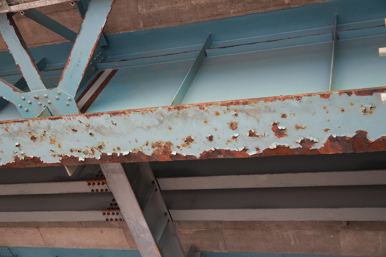 塗膜の劣化、鋼材の腐食、コンクリートのうきや剥離、鉄筋露出、鉄筋の発錆などが確認できる。
