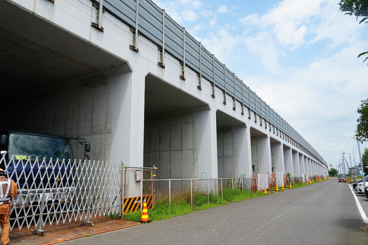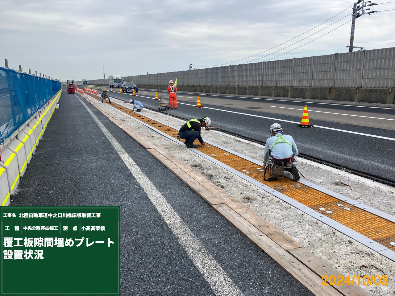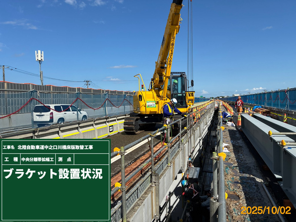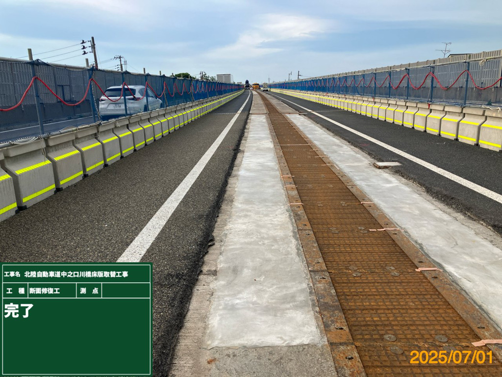 NEXCO東日本新潟支社は、北陸道三条燕IC~巻潟東IC間の中之口川橋上下線及び小高高架橋上下線の一部の床版取替工、その他の部分の床版補修、防水工の施工および壁高欄取替工などを行っている。施工にあたっては、約1.5kmの区間を規制するが、約4万台の交通量を捌く必要があるため、車線数は維持したまま、車線ごとの幅員を3,500mmから3,250mmに縮小すると共に、上下線の離隔が約1,000mmであることを利用して、上下線を一時的につなげることによって、そのスペースを利用して上下線合計4車線を確保し施工する。現在は、床版取替の準備工ともいうべき、上下線の隣接する主桁を横桁で繋ぎ、さらにその上に縦桁、覆工板を設置し、舗装を敷いて一時的に一体化する工事を進めている。その現場をお届けする。(井手迫瑞樹)
