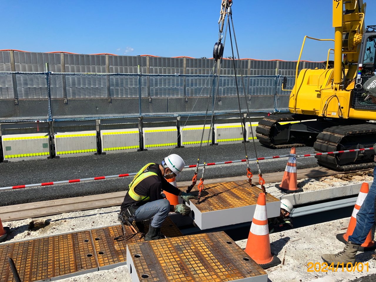 さらにその上には中之口川橋では幅1,000×長さ1,000mm、小高高架橋では幅800㎜×長さ1,000mmの覆工板を配置した。覆工板と縦桁はL型フックとボルトを用いて締結している。覆工板と張出し端部に生じてしまう隙間には、150mm幅のプレートを配置した。覆工板との接続は覆工板と縦桁をボルトと金具にて固定する。